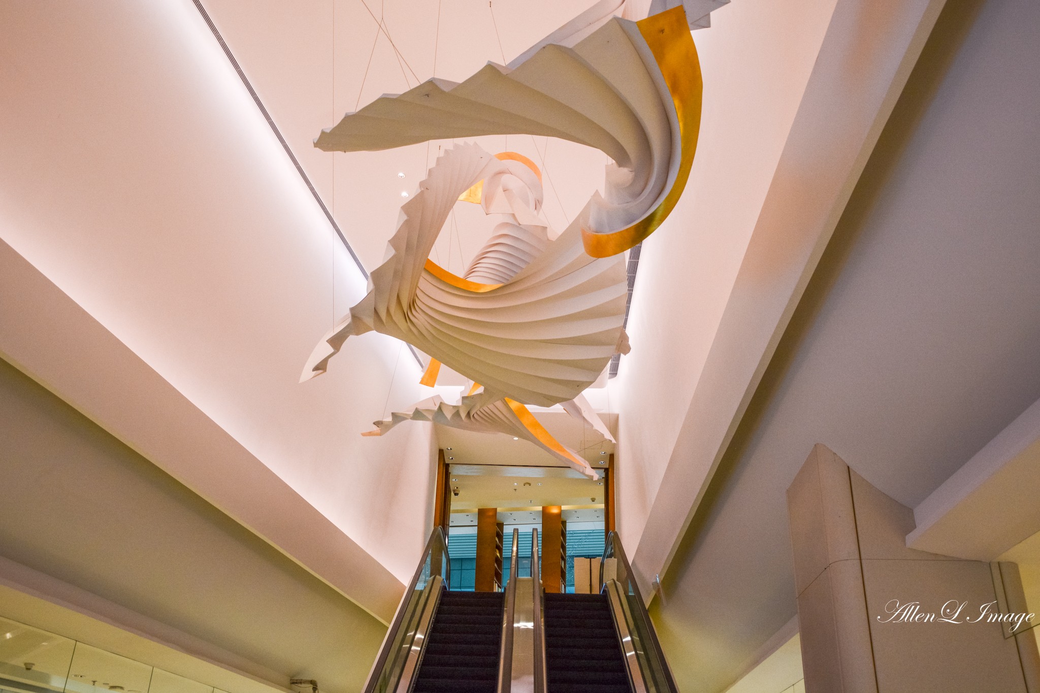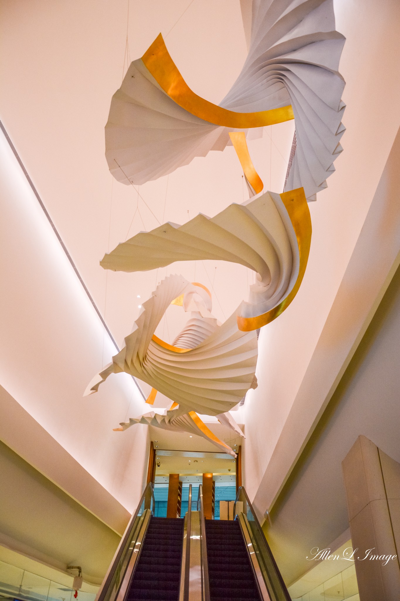 这个是比较容易发现的展品,大概位于前檐书店前方,随着电梯的徐徐上升,人们可以仔细揣摩这一串云朵一样的作品,其中孕育的流动感让我很是着迷,让我联想起连绵的山川、空中的飞鸟、激荡的浪花……