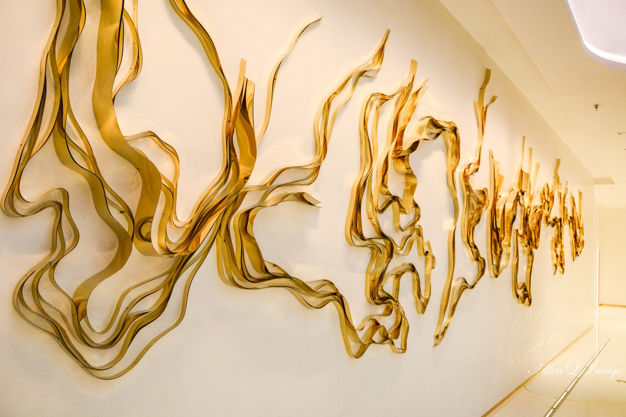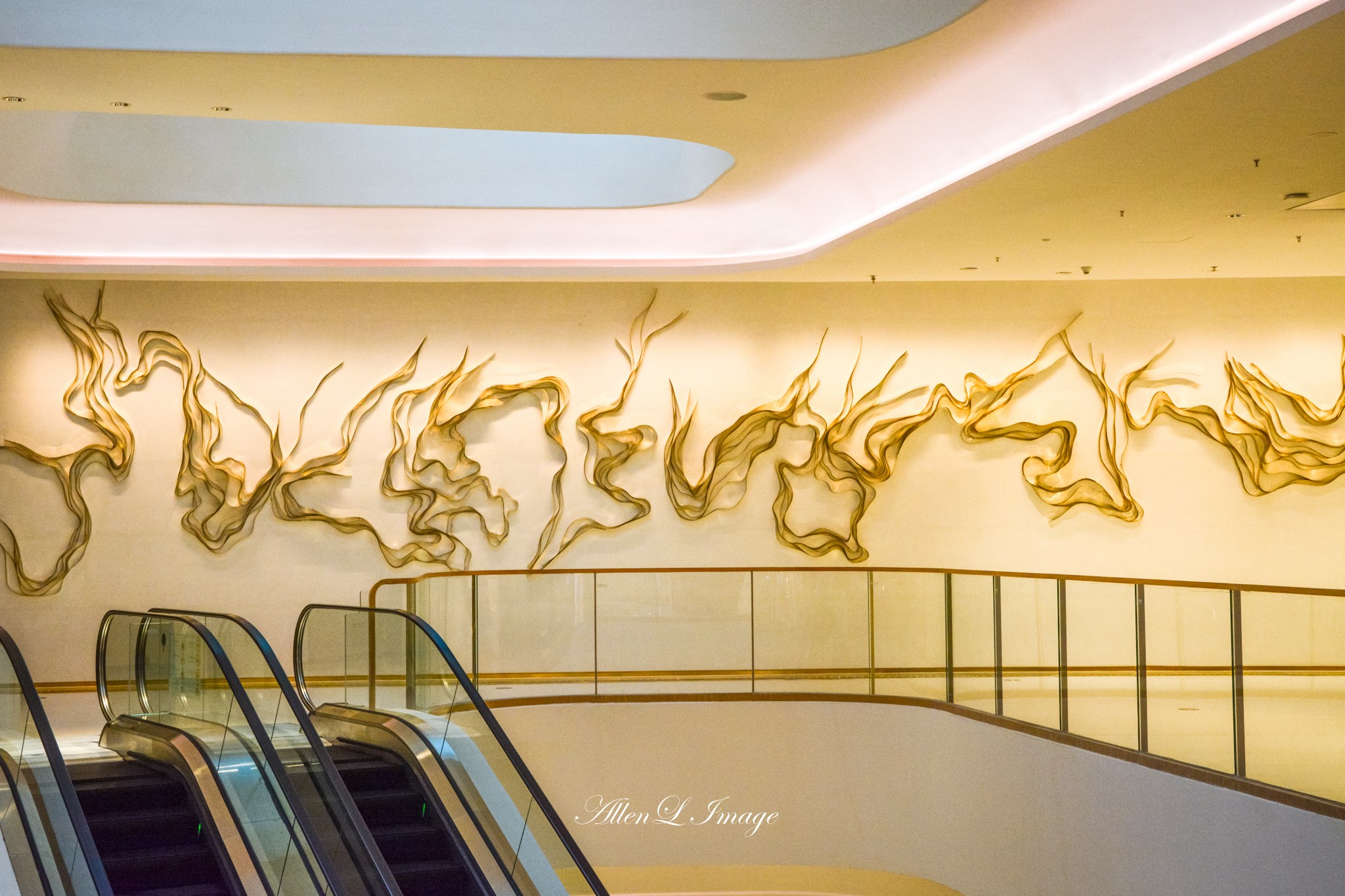 这件艺术品的寻找难度略微提升一个等级,隐藏在商场的一面白墙之上(线索:高层区域),由加拿大华裔艺术家Dennis Lin设计,以918米的镀铜不锈钢条勾勒出深圳湾的轮廓。