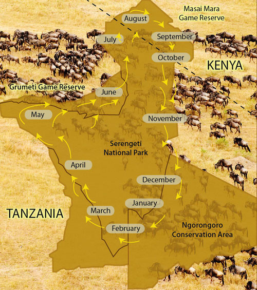 每年的12月到第二年的5月之间,食草动物们悠闲的生活在塞伦盖蒂南部。这里有着丰美的水草为它们提供了足够多的食物。5月中旬开始,草原迎来了它的旱季,水草不能满足大量食草动物们的需求,所以动物们开始向塞伦盖蒂的西北面迁徙,只为追赶青草和水源。