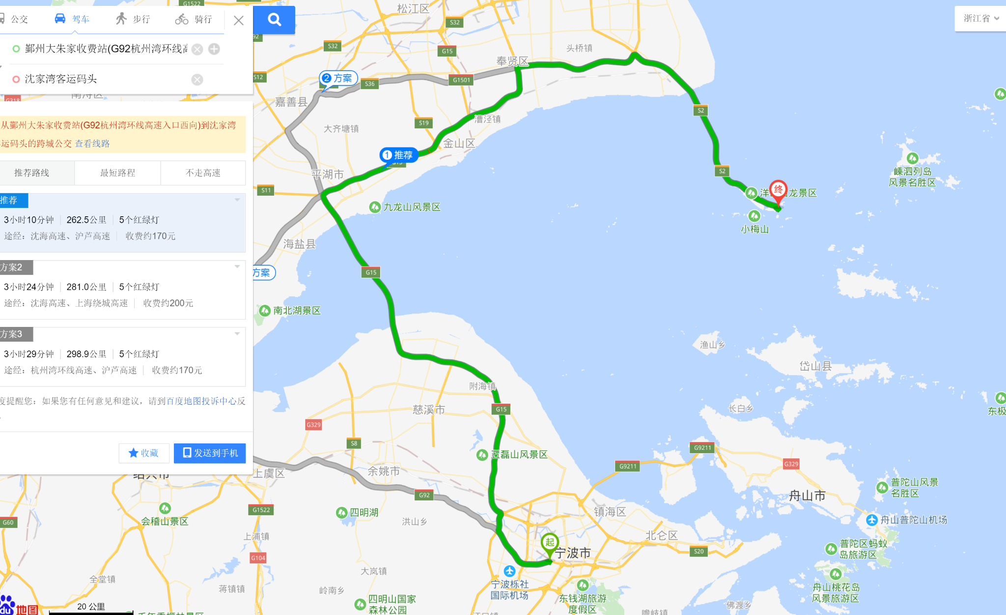 1、从宁波到沈家湾码头:全程260度公里,耗时3小时20分钟。