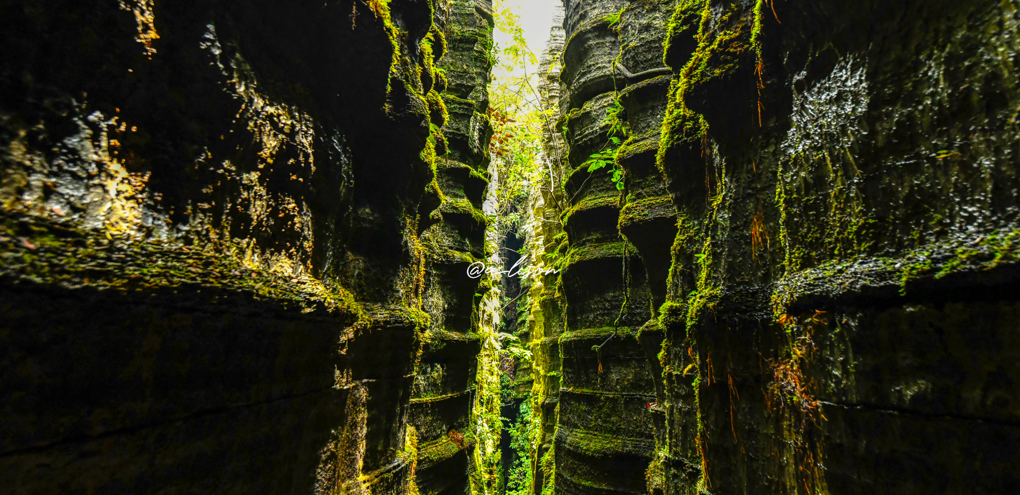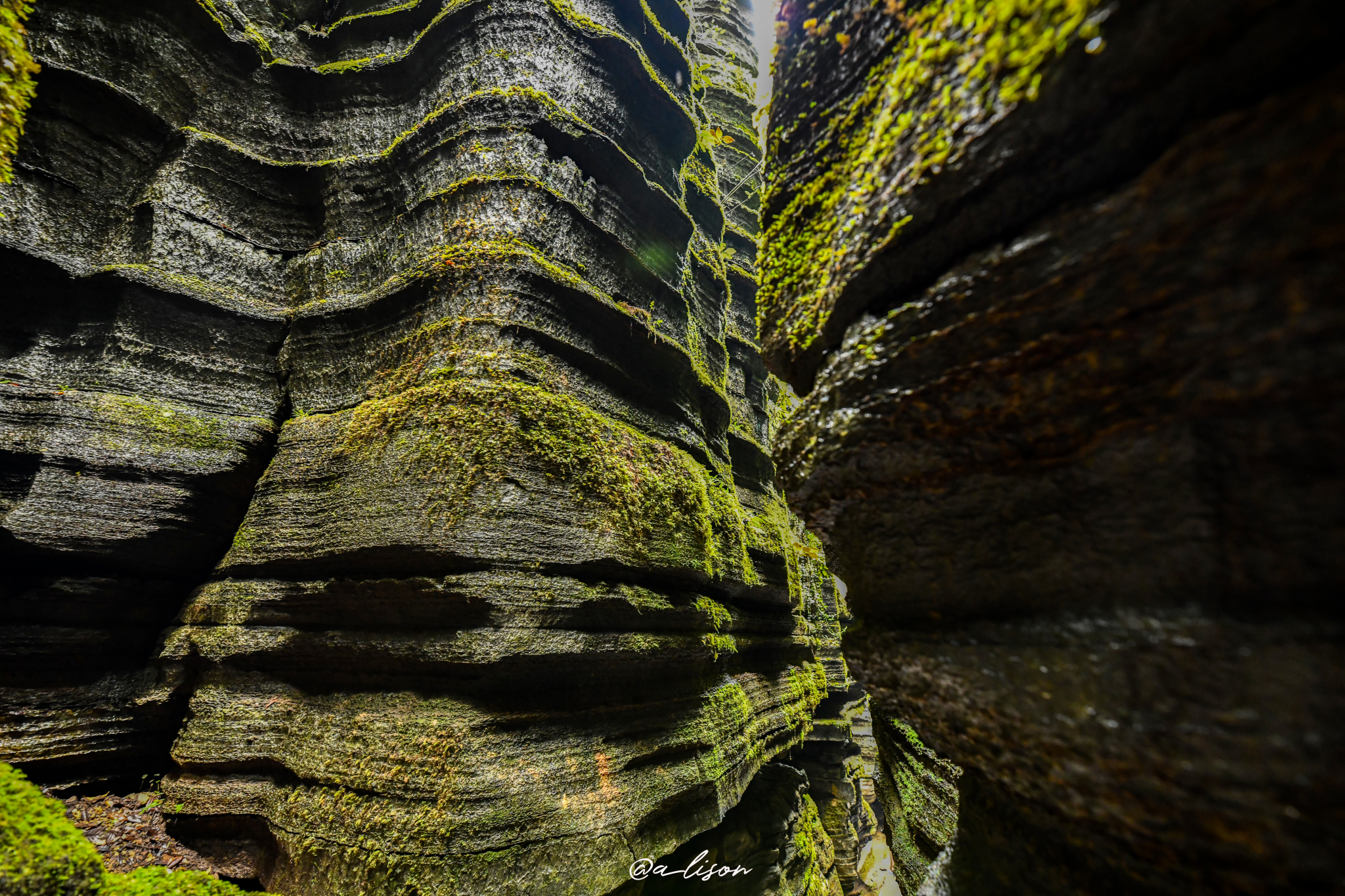沿着犀牛沟的步道越往里走,两岸的峭壁挨得越来越紧,让我们有一种绝处逢生的感觉。阳光透过峭壁顶撒到步道里,完全感受不到炎热,反而是一丝丝凉意袭人。