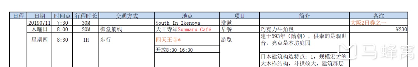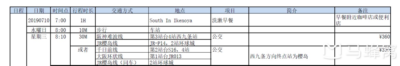 事先查询了祇园祭官网,以必须报到的前祭--神幸祭山鉾巡行作为时间节点,以各个打卡景点作为空间节点,以关西各城的美食与制作作为体验节点,以交通方式作为线索,以自己乱写的景点简介作为资讯补充,穿成了一份18页349行的表格,就是下面酱紫的,最后一栏有写的价格是日元计的当次车费。对了,这个祇字念齐,不能念成纸或者底,多音字,因为不同的用法读音不同(祇园意来自于佛教),日文发音是吉,跟中文的正确发音接近。百度百科又是错的,在这篇游记里,发现百度错误的不止一个,没文化当属百度第一。(补记,最近内容被人改过了,但搜索上还是写念zhi)