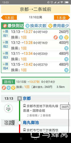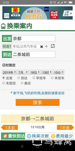 出发框里填写始发站,到达框里填到达站,日时指定是自动显示当前时间,也可以选比如明天一早5点要出发的,车次就会显示可乘的,不可乘的就不显示,选到达时间的话,可以知道什么时候需要坐上车。选好点击搜索,比如现在自己在京都站,要去二条城,二条城最近的车站是二条城前站,如下