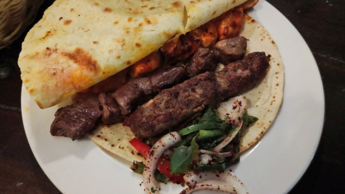 一般当地餐厅会配给免费的皮塔饼(Pita),这种烙饼应该算是的主食了。虽然不是很难吃,可是每顿饭都吃,就有点过分了……差不多长这样,很顶饱。就连你在路边小店撸串他们都会给你一张饼让你包着吃。