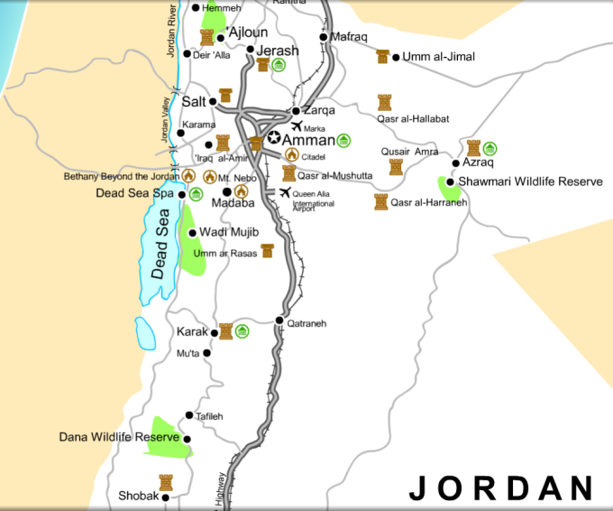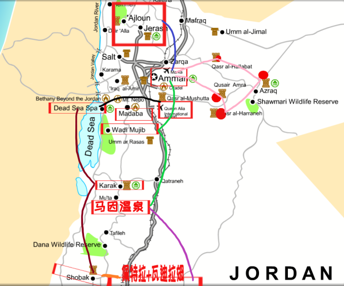 安曼省及周边:安曼市区、死海(Dead Sea)、马代巴(Madaba)、穆吉布自然保护区、耶稣受洗池