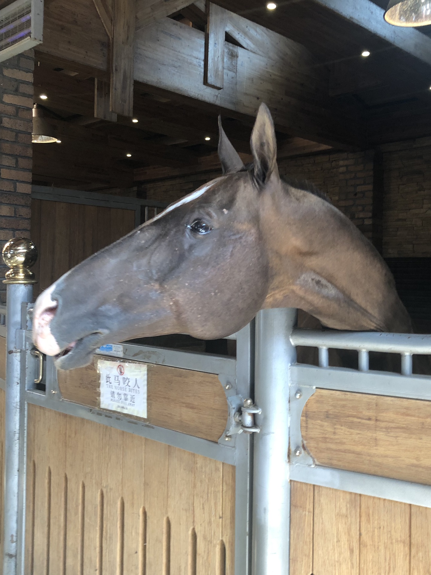 这匹是大大的马,在2014年由土库曼斯坦总统别尔德穆哈梅多夫在北京出席世界汗血马协会特别大会暨中国马文化节开幕式时赠予。据说此马性子很烈,且高傲无比。结果,就我们在这个马厩刚看了十来分钟时,它就自己把门打开,跑到对面,和对门的家伙“吵架”起来了,果然是既聪明又桀骜不驯!