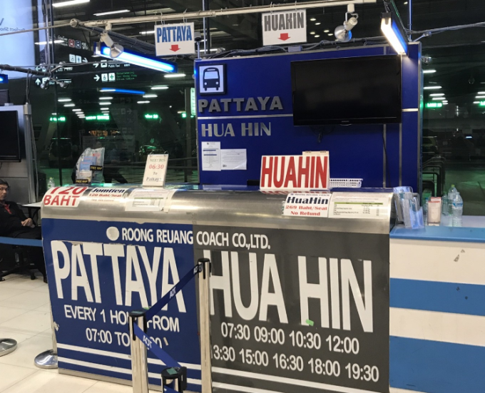 第一步:下到机场1楼,找到8号门,在机场里面有售票服务台,柜台是到芭提雅和华欣的,发车时间是每一小时一班,不需要预约。