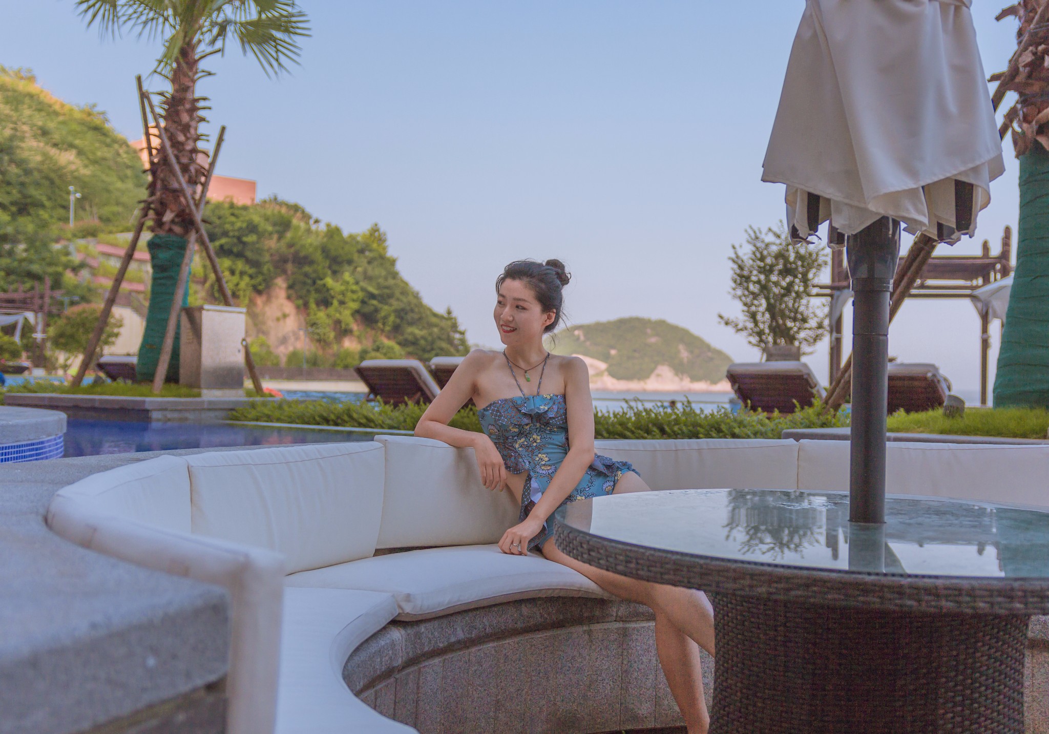 泳池边的圆形下沉沙发也颇有东南亚的风情