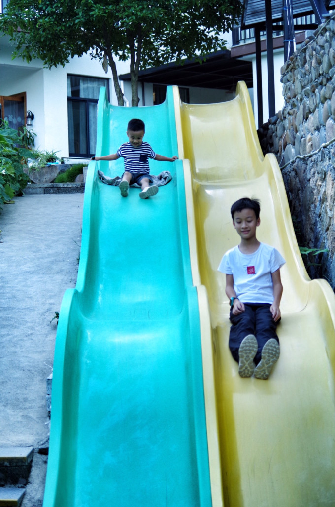 客栈自带的设施挺齐全,尤其是孩子可以玩耍的地方,室外有一片大草地,泳池、蹦床、超长滑梯、吊床吊篮、秋千等,室内有投影仪看电视电影、游戏机、架子鼓、小零食,带上孩子来这里住上几天,即便足不出户,也可以享受几天放空自己和放养娃的乐趣。