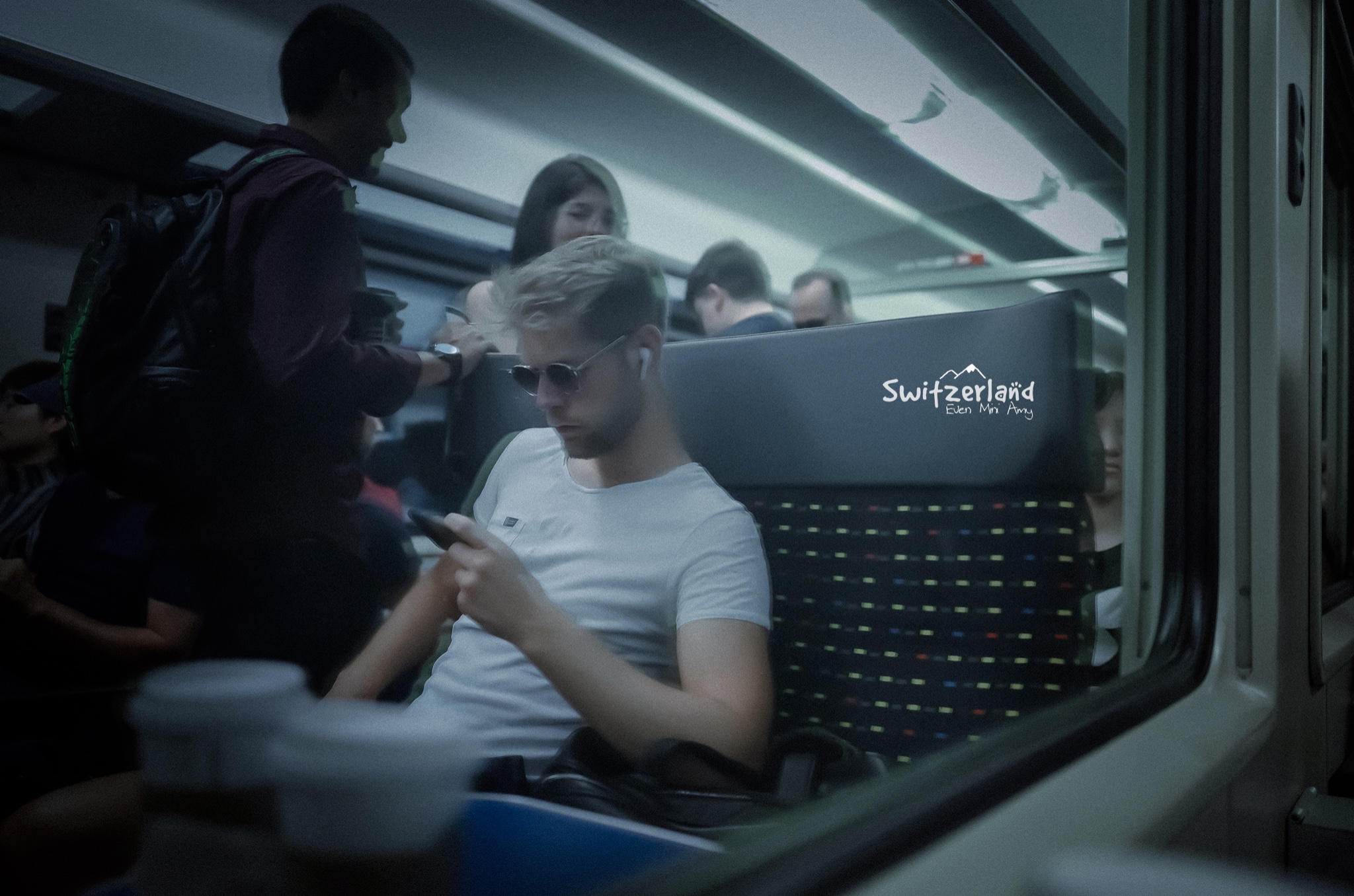 我对面蓝色小圆点布艺座椅上,是一位金发帅哥,从反光的窗户偷拍一张。