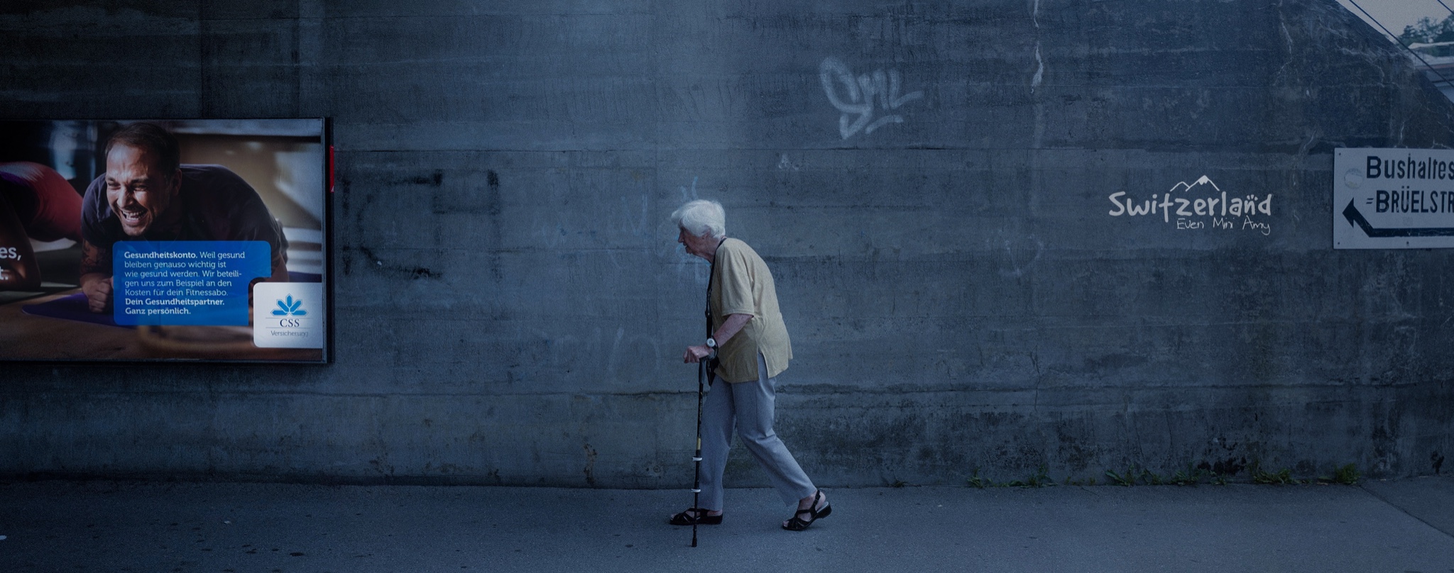公交车窗外的老妇,和广告牌里大笑的男人,总觉得这张照片有点特殊的意义。