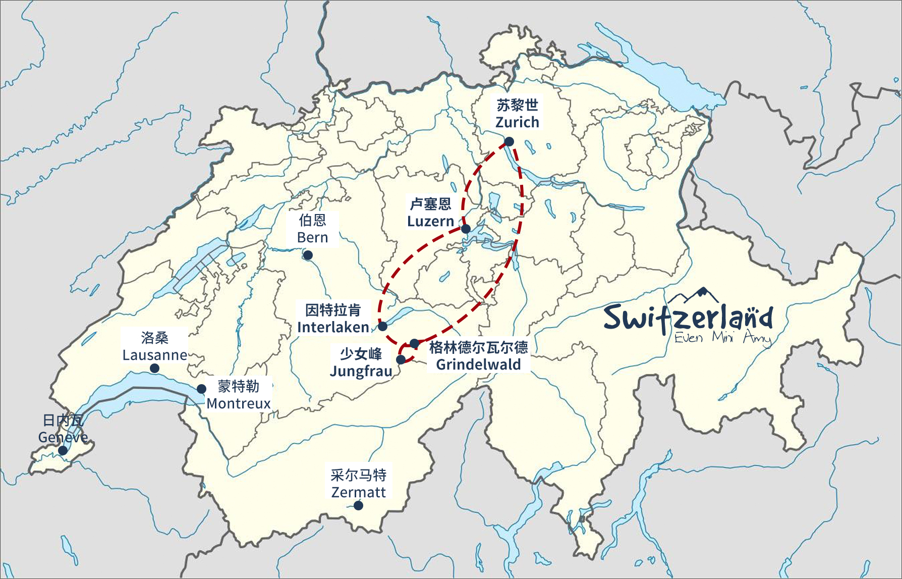 此行瑞士待了5天,主要是北部地区,瑞士主要地区以及我的行程在下图标出来咯