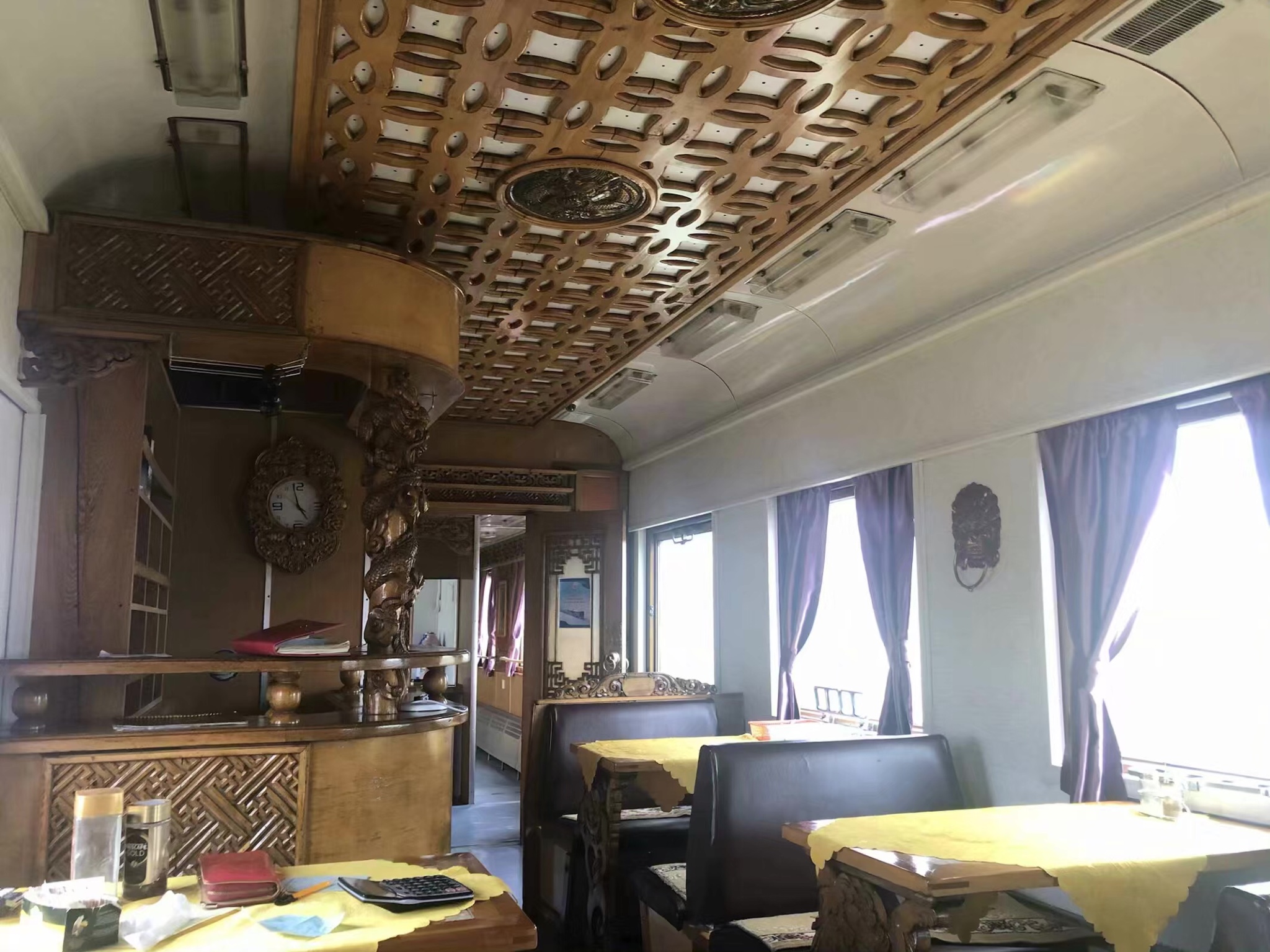 列车驶离乌兰巴托已是当地时间下午3点半。由于中午饭点那会儿列车经过的景色实在迷人,以至于我们都没有任何饥饿感,加上在乌兰巴托街头的暴走消耗,使得现在我们一个个都饥肠辘辘。那就蒙古餐车走起??说走就走,我们一行前往位于列车末端的蒙古餐车。蒙古餐车的装修设计相当复古。(很不好意思的是菜单和菜都没拍。。。)不用担心语言不通,菜单上带英语且都有图片。人均3w蒙图就够了。