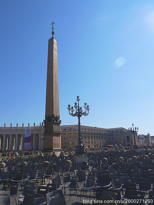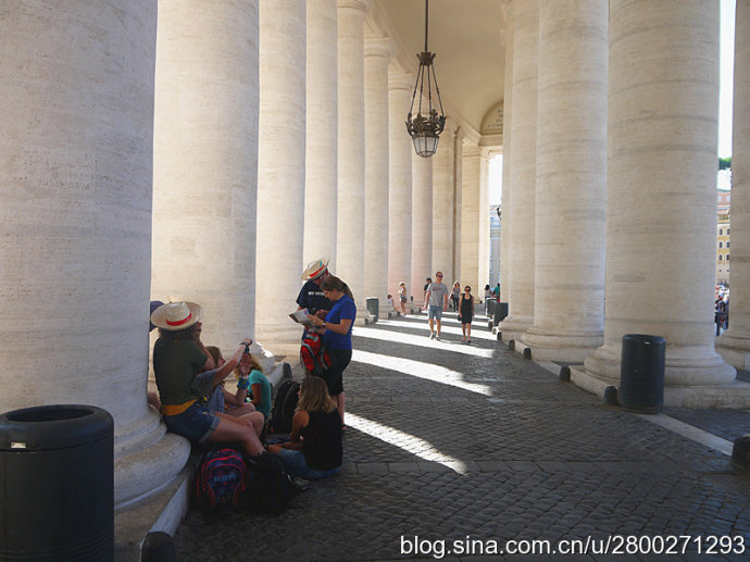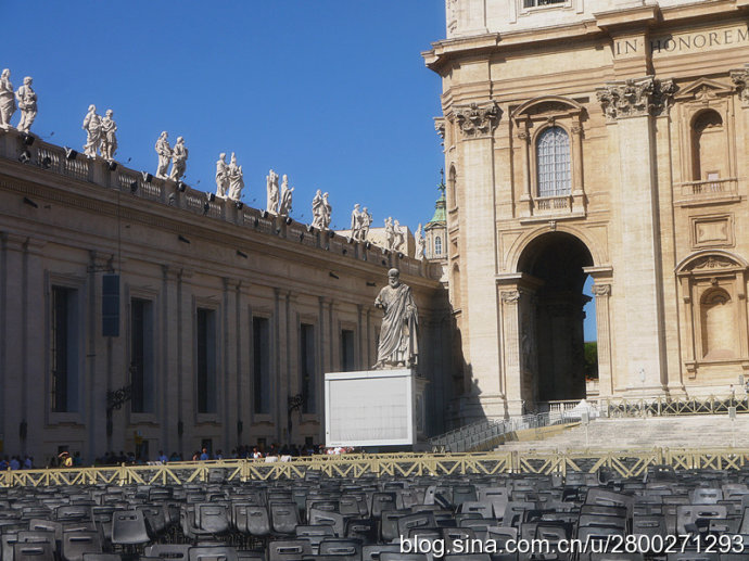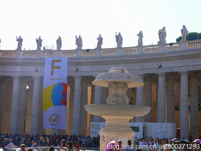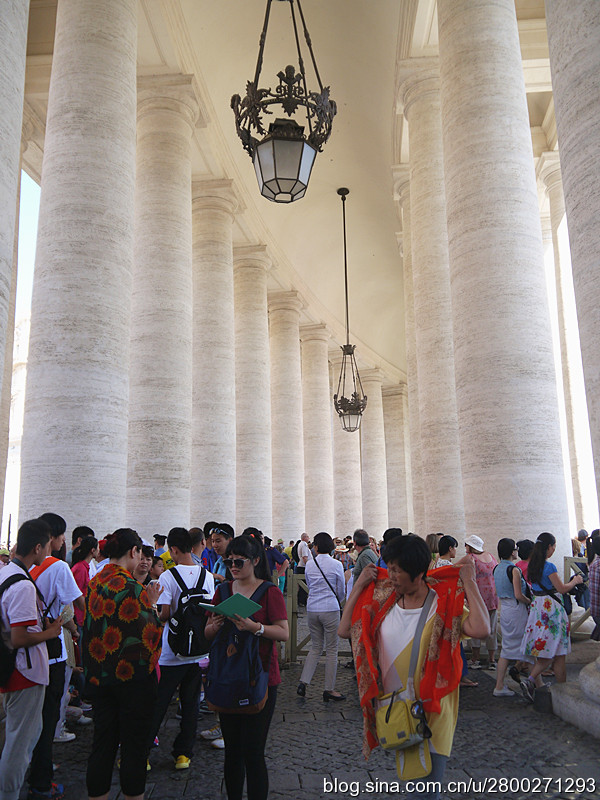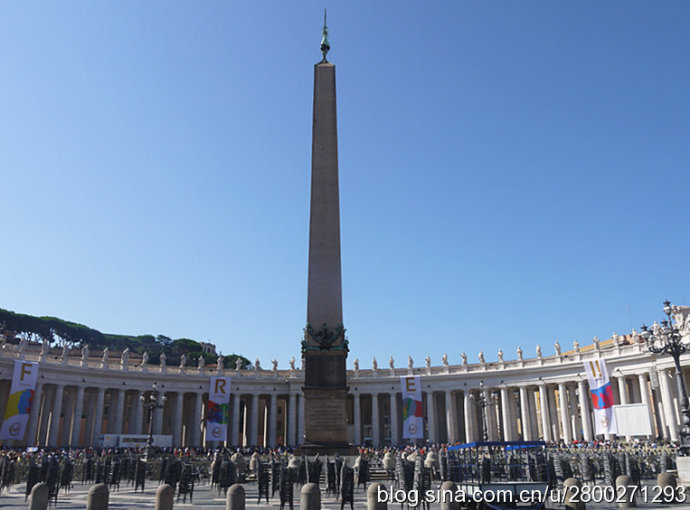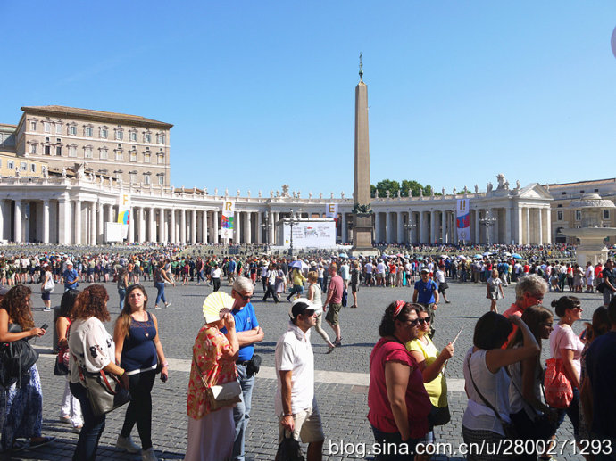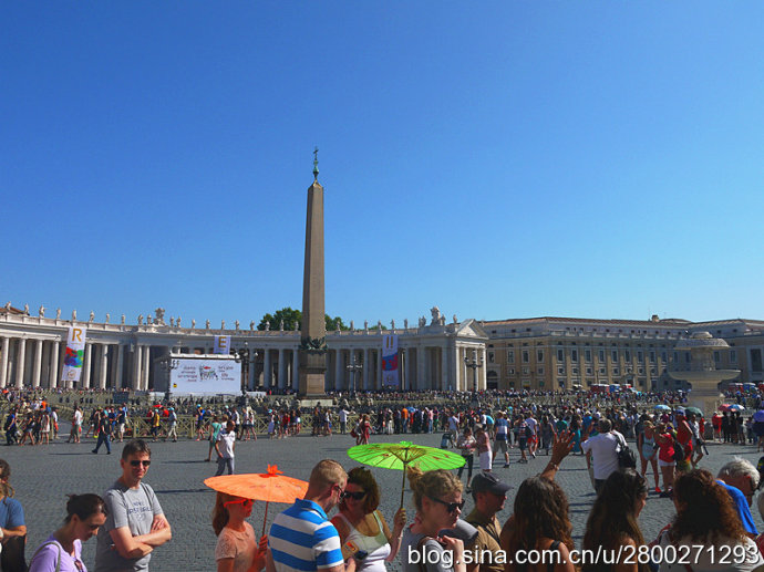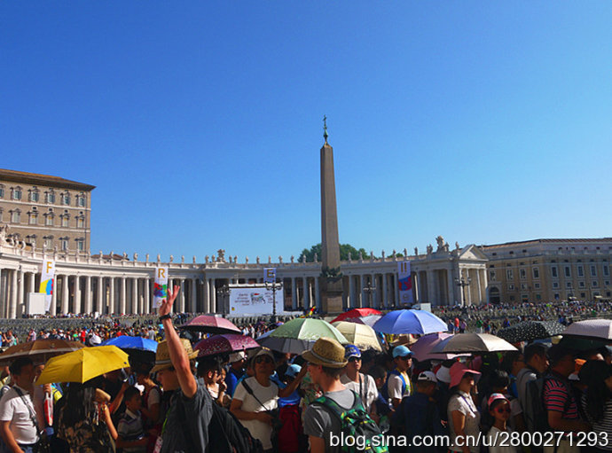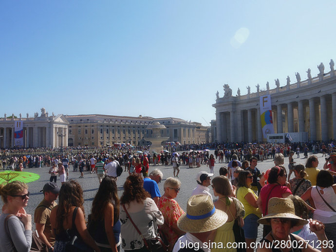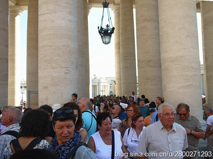 当然大教堂外观和广场也很有看头。巴洛克式大教堂有一个米开朗基罗设计的圆形穹顶,是罗马城的制高点,相当的有气势。教堂的廊檐上方有耶稣和他的12个门徒雕像,两侧有两个大钟,分别显示格林威治时间和罗马时间。大教堂前边一左一右是圣彼得和圣保罗雕像,圣彼得手拿两把通往天堂和地狱钥匙,圣保罗手持殉道长剑。广场中央是公元37年从埃及运来的方尖碑,碑尖是倒十字架造型。据说圣彼得在临刑前只说了一句话:“我比不上我的老师,请让我倒着死。”他就是在这里被挂在倒十字架上。广场两边是贝尔尼尼设计的半圆形长廊,每个长廊有284根巨大的圆柱,顶上是142个殉道者雕像,雕像出自贝尔尼尼和他的学生之手,人物神态各异 ,栩栩如生。广场中心两侧有对称的两个喷泉,有一侧的是贝尔尼尼设计所建的复制品,我们去的那天只看到一个喷泉,还没有喷水,另一个围起来了,好像是在维修,也不知道我们看到的是哪个。广场地面是黑色的小方石铺就,教皇出资修建,因而被称为“教皇的金币”。这个广场是大教堂的扩展和延伸,气势恢宏,精彩纷呈,再加上汹涌的人潮,使人不由地感觉到一种宗教的力量。