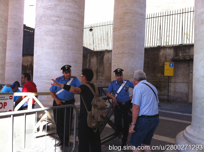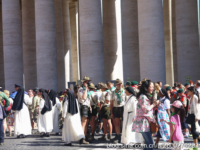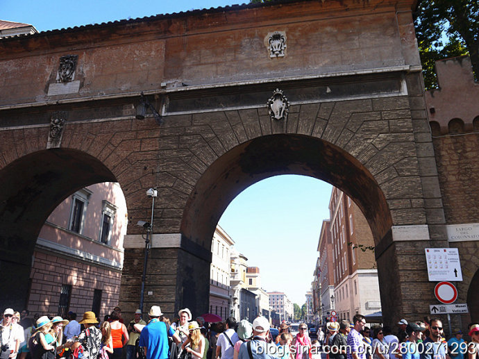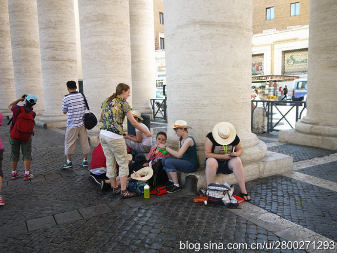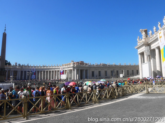 我一直以为人山人海只是中国特色,但是来到这个观点被颠覆了,圣彼得广场人潮如海,世界各地的旅游者来到这块巴掌大的地方,长蛇阵般的人流绕着广场蜿蜒曲折地缓缓前行,炎炎的烈日下人们耐心地排着队等着参观圣彼得大教堂。导游告知,看这阵势我们得排一上午队才能进到大教堂,按照原先一个半小时的安排显然来不及了,为了不影响后面的行程,他要我们别排队了,给半个小时在广场拍拍外景。呜呼,这个可以容纳6万人的世界上最大的天主教堂进不去了,米开朗基罗的雕塑《圣殇》、《摩西》看不到了,与《圣殇》同为宝中之宝的贝尔尼尼的作品青铜华盖和圣彼得宝座也都看不到了。另外博物馆据说堪比大英博物馆和卢浮宫,藏有历代教皇收藏的稀世珍宝,特别是绘画和雕塑作品,其中的西斯廷教堂里有米开朗基罗的天顶壁画《创世纪》和祭坛壁画《最后的审判》,这两幅纪念碑式的壁画代表了米开朗基罗绘画的最高水平。要参观博物馆随团几乎是不可能的,所以我们也是看不到的。我们在看到最多的是人,广场上熙熙攘攘、摩肩接踵、各种肤色的人。