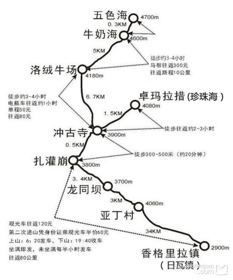 景区大门位于香格里拉镇,景区禁止私家车进入,购票进入景区后必须乘坐观光车,终点为扎灌崩,扎灌崩步行500米即可到达冲古寺。冲古寺为分叉口,一条短线,终点为珍珠海,只能步行往返;另一条长线,终点为牛奶海、五色海,其中冲古寺至洛绒牛场段可乘电瓶车or步行,洛绒牛场至牛奶海可骑马or步行,牛奶海至五色海只能步行。