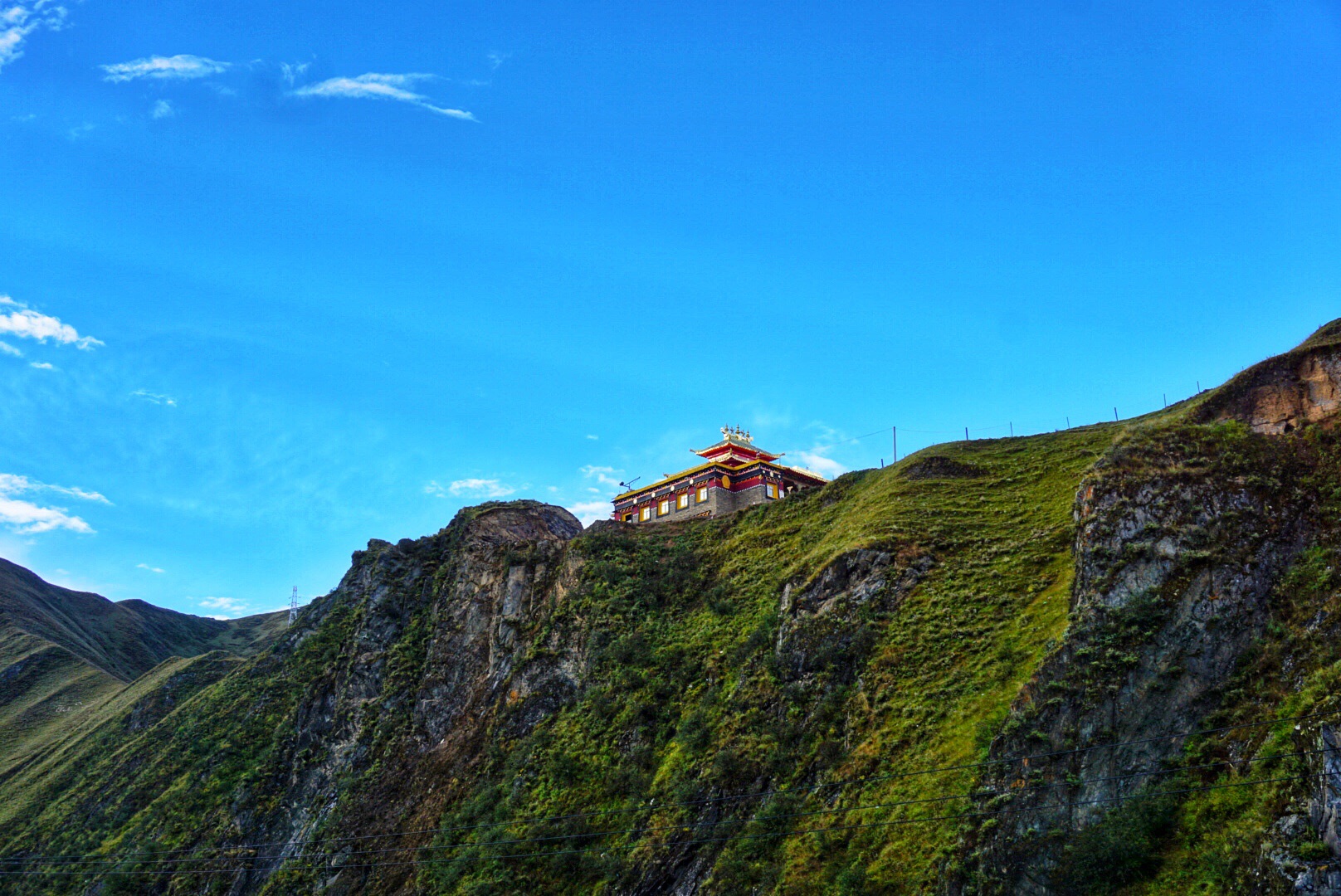 天空越发干净,我们爬到了这座寺庙那里。新都桥海拔3300米左右,属于高海拔地区,上山的路已经感受到气喘。