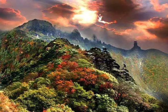 梵净山是西南一座具有2000多年历史的文化名山,更是贵州省难得的红叶观赏区,深秋时节,漫山枫红。这时的梵净山上,大片的红枫,夹杂着绿树与黄叶,色彩缤纷,在云雾的衬托中,愈发显得迷幻了。