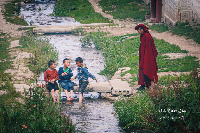 第一天来到这里,主要逛的是四川部分的郎木寺。沿着路一直走就到了格尔底寺,寺后就是郎木寺的发源地:纳摩峡谷,一条叫白龙江的小溪就从里面缓缓流出。别瞧它宽不足两米,名字可霸气嘞!