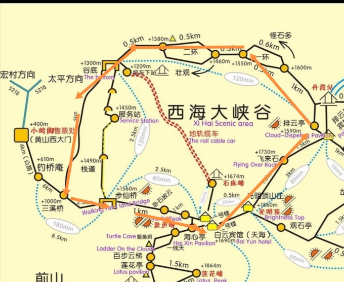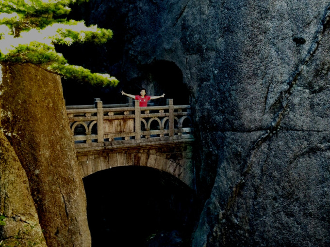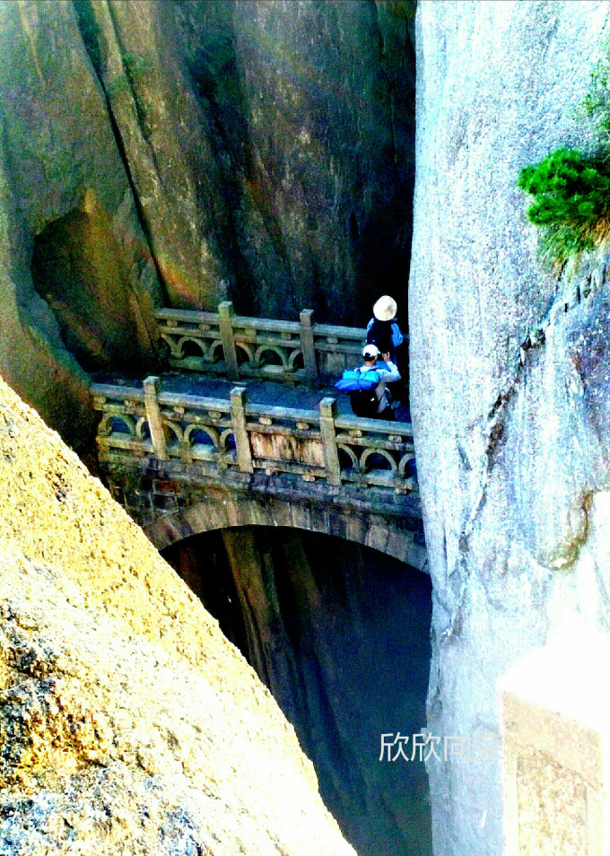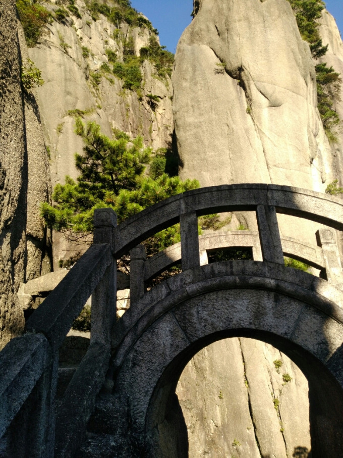 步仙桥是黄山绕谷路线地标。在白鹅岭咨询点。一年青工作人员,表示如有时间,中午从三溪口过去没问题。并称步仙桥已被世界网友评为20座"仙境之桥"之一。原打算西海就是玩一天,如中午到谷底,剩余时间可一路观景去白云景区。这样从白云出发反时针回到白云,正好是完成西海大峡谷全程徒步。(实际上从谷底从三溪口绕道至步仙桥已在峽谷外,因原有的去步仙桥的栈道被封。)
