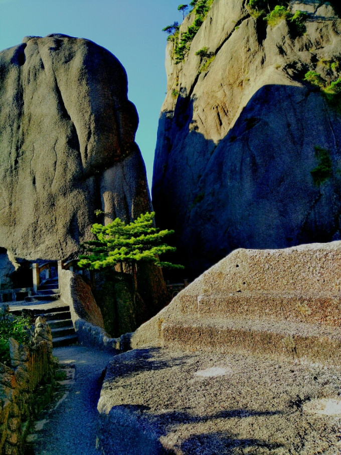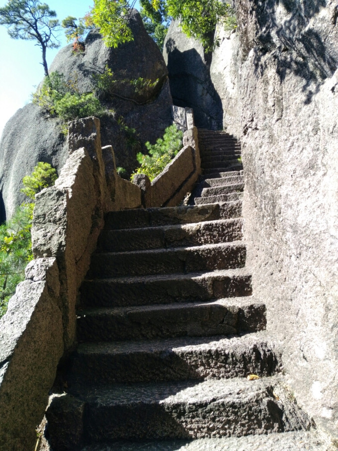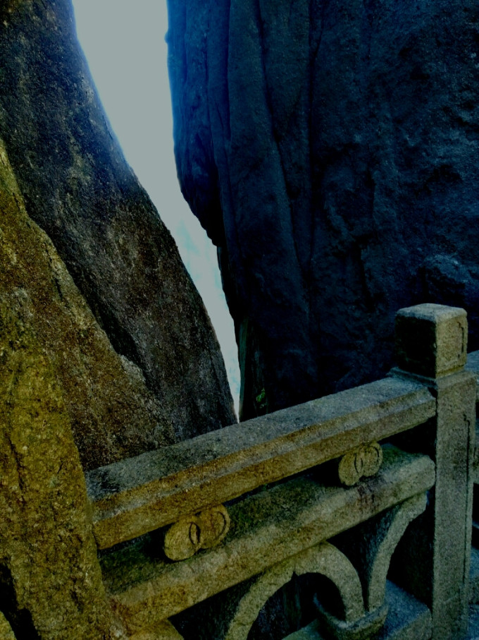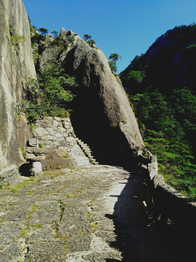 一线天附近,停下与一位热情的值勤民警聊天,他称此一线天也是黄山中几个之一,离桥已不远了。并指出附近仙人踩高跷等观景位置。他的上下班方式很奇特,三溪口到步仙桥,每天来回两次,中午要下山吃饭。可能也是安全巡视的工作要求。一天4小时花在山路上,虽然很辛苦,比起伟大的挑夫每天送沉重的水泥上山的艰辛(报酬按斤论价),也算是轻松的了。