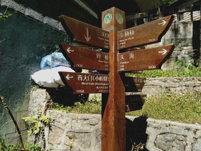 路口高悬警示牌。去天海有4小时的路程。(一般体力或时间不够,不建议走这全程)