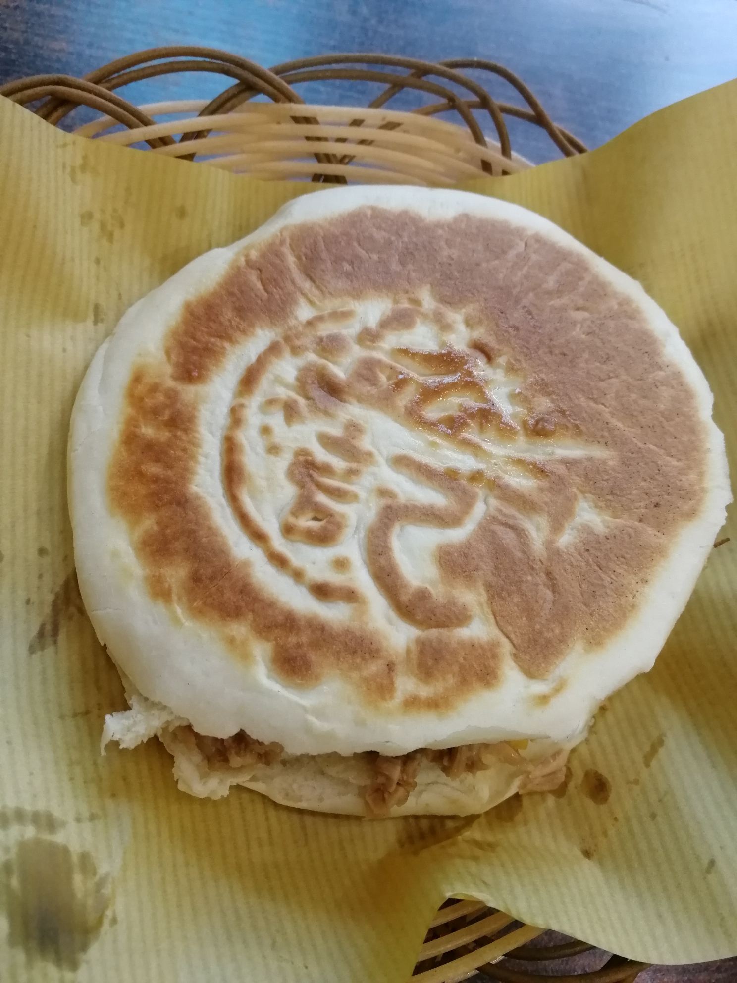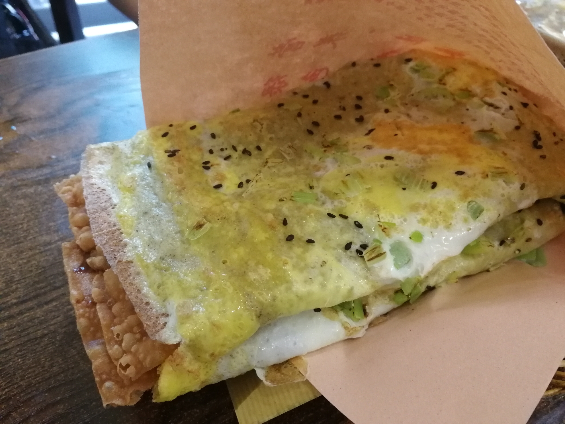 我G就想吃个正经的煎饼果子,酒店附近就有一家,大成盛记!步行过去几分钟,人还真不少!他点了煎饼果子和豆腐脑,我脑袋被门挤了,点了肉夹馍和皮蛋瘦肉粥!最后我G还是强制吃下了我点的粥