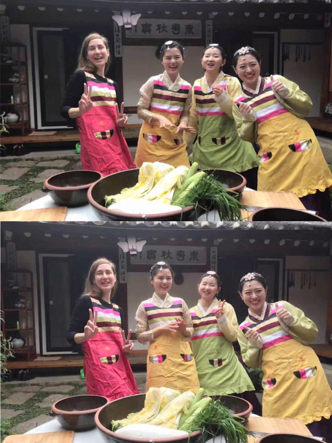 下图是泡菜准备完毕我们在准备凳子开吃,我和来自俄罗斯的Luna小姐姐。