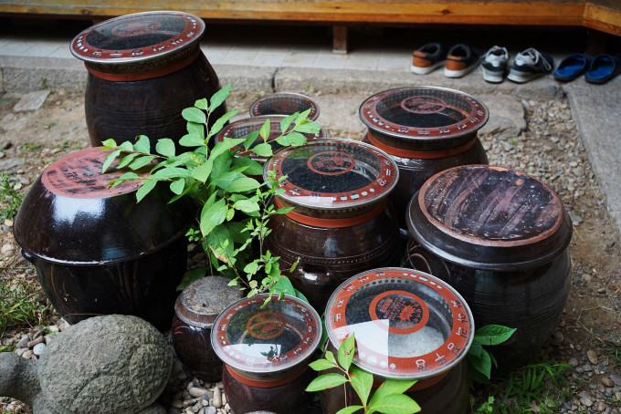 院子里摆放了大大小小的罐子,里面塞满了各种酱料。