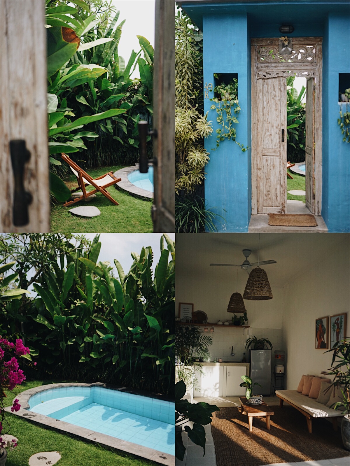 这间是我常驻的一栋,如果需要待半个月以上我都会选择这里,管家就住在旁边,人非常好,随叫随到,有次我是深夜的航班,下午就要退房,拍摄一天想洗澡再去机场,她特意给我开了一间房间,叫我不要和房东说,绕着摄像头走,整栋别墅有四间房,没有巴厘岛全白编织风格,房间是复式设计,光线很好,也干净,每天管家们都会打扫,厨房也可以做饭,泳池的水每天都会清理。