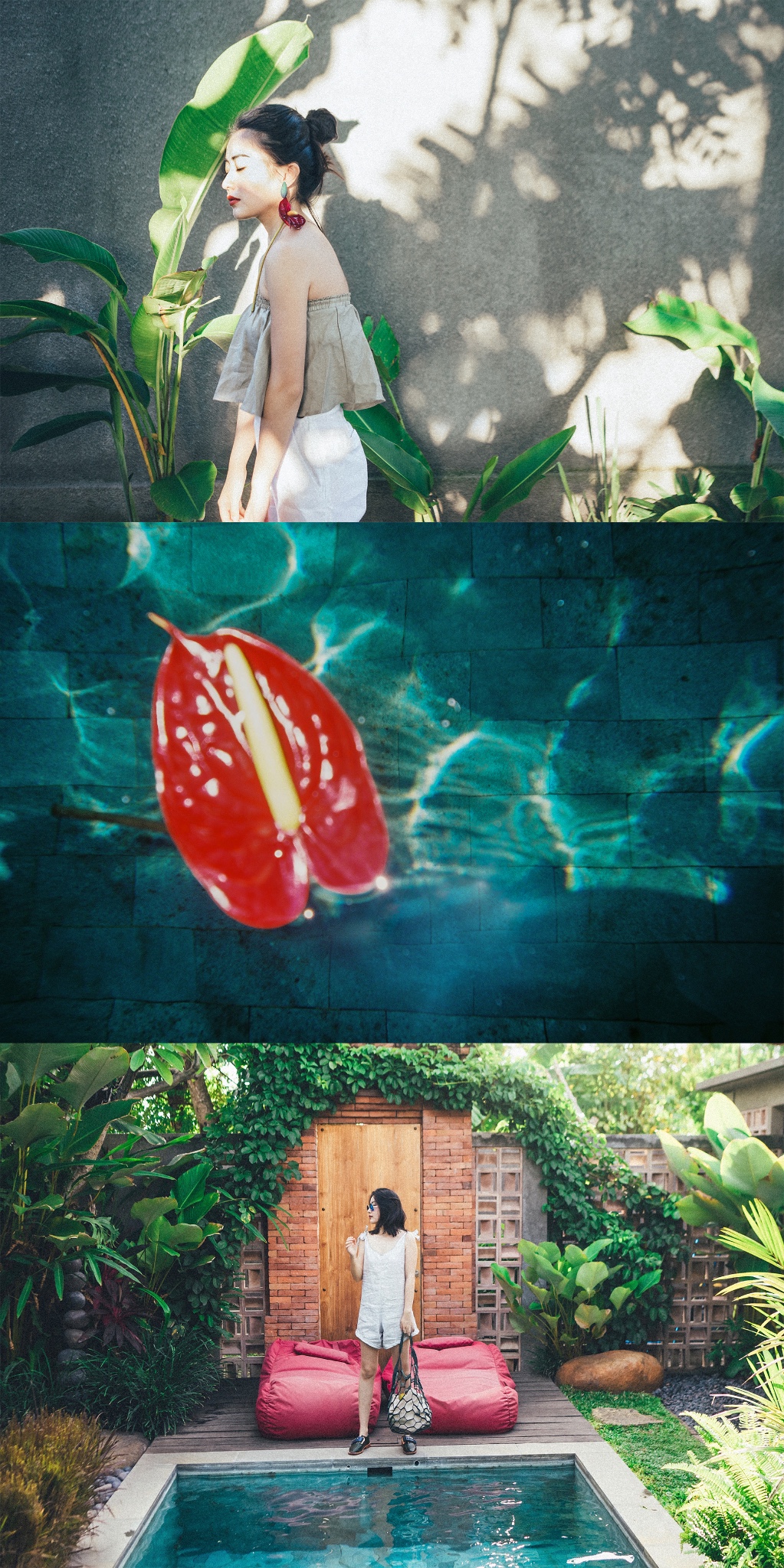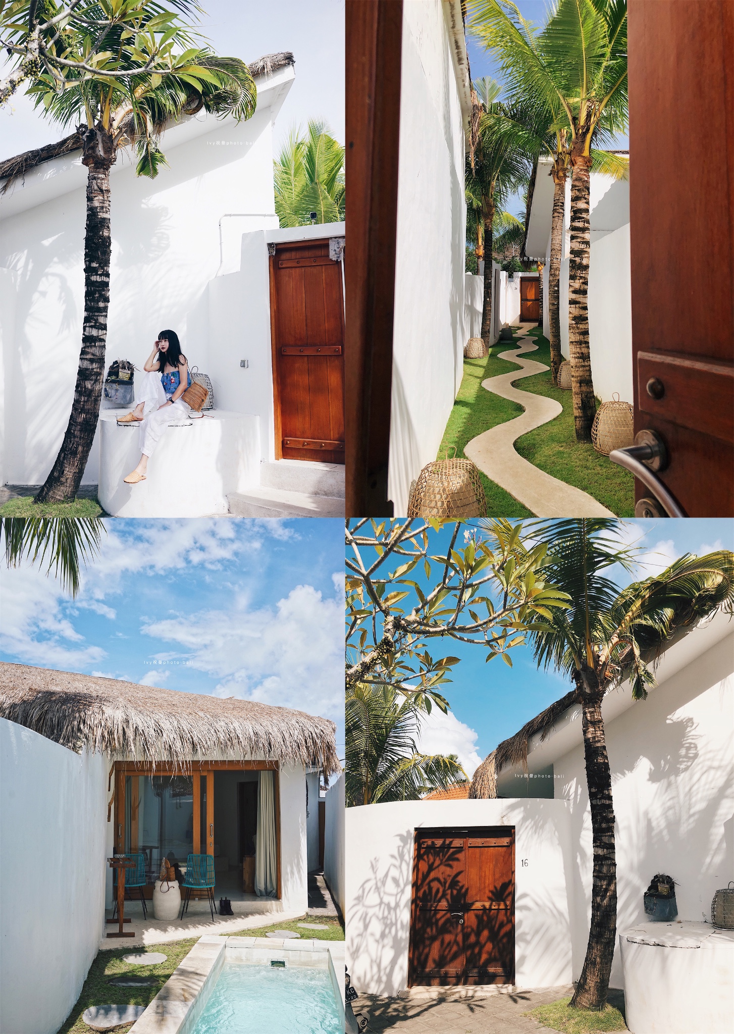 早上的光线把树叶都印在了白墙上,推开门,弯弯小道,每一间都带独立泳池,适合短期入住,简单的背景加椰子树拍照简单好看。