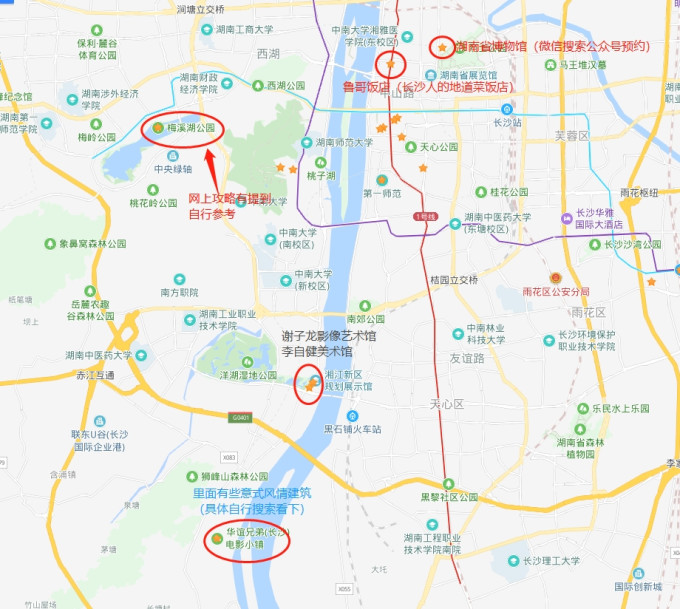 三天基本能玩完,图片中的景点标记附有tip(画重点),此外,地图上标记所提及的华谊兄弟电影小镇、梅溪湖公园,风景都不错,如果想更详细的了解,可网上自行搜索下,但交通上相对比较远,出行自行选择。