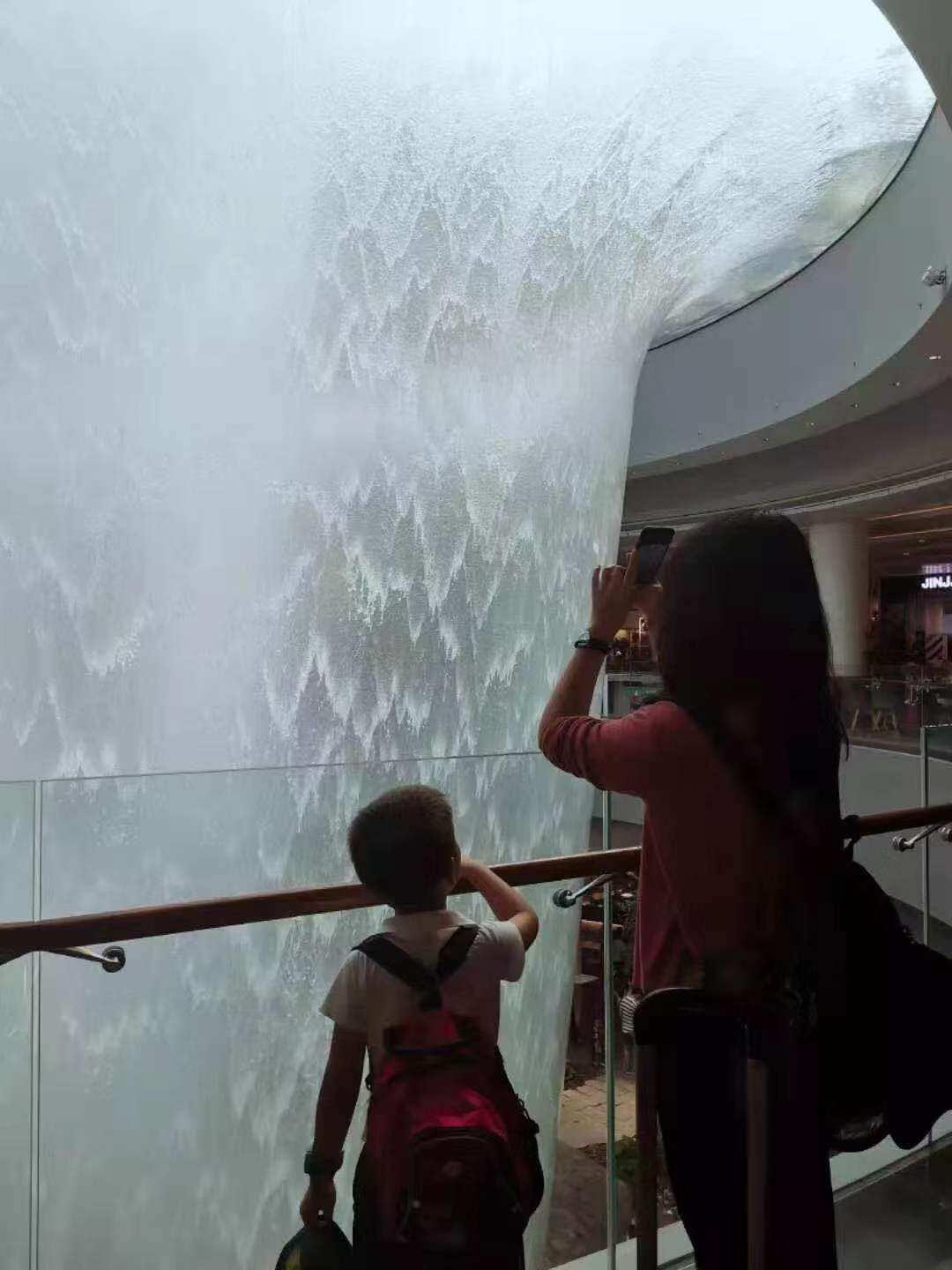 尽管交流失败,也丝毫不影响小付同学的愉悦心情,连蹦带跳的拿着passport自己过海关,在得到海关叔叔的表扬和一颗Candy的奖励后,我们见到了热情接机的刘导,也看到了这个绝无仅有超级震撼的室内大瀑布!