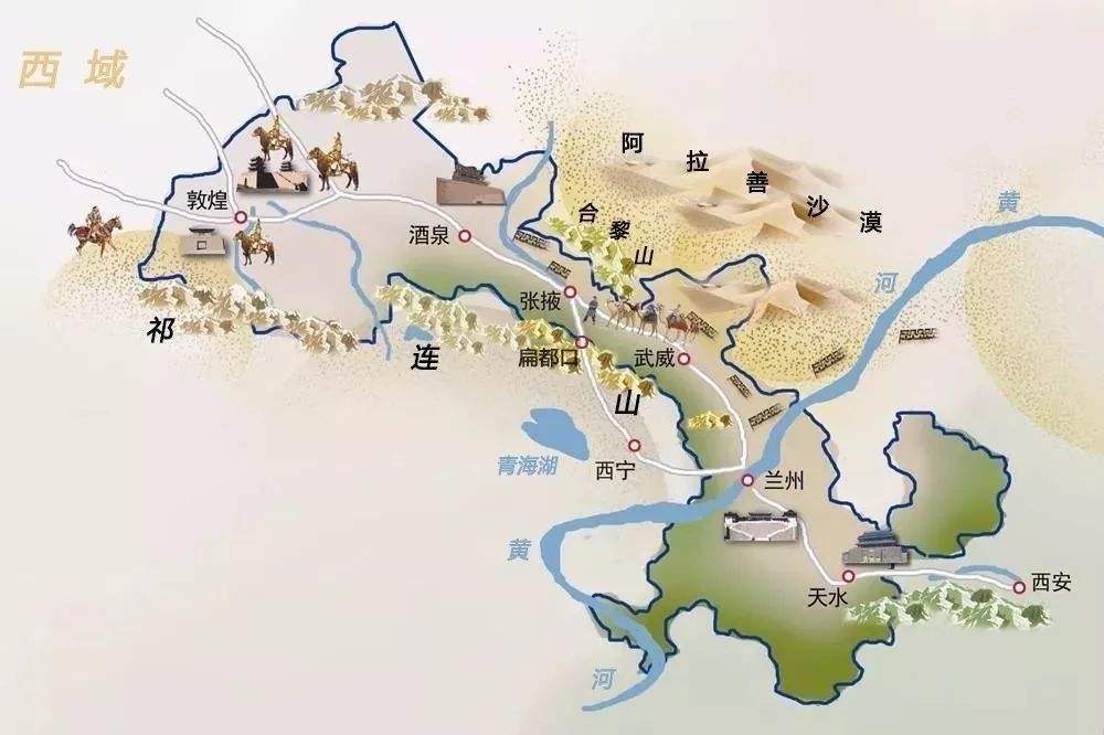 初次听闻武威这个名字觉得好俗气,后来才知道这名字大有来头。汉霍去病远征河西,击败匈奴。随后汉武帝在河西走廊设立河西四郡,为彰骠骑将军之“武功军威”而将最东端的这一郡命为武威。由东往西另外三郡的名字及含义如下:
