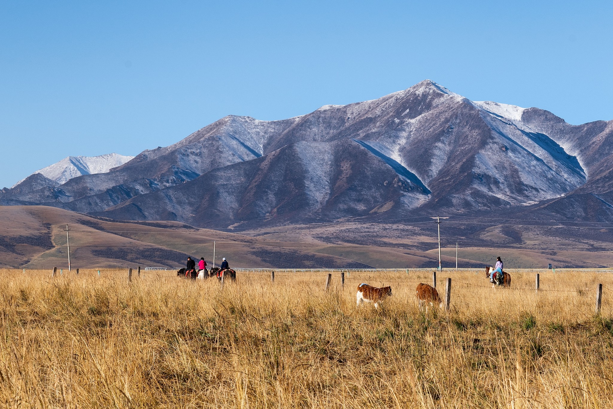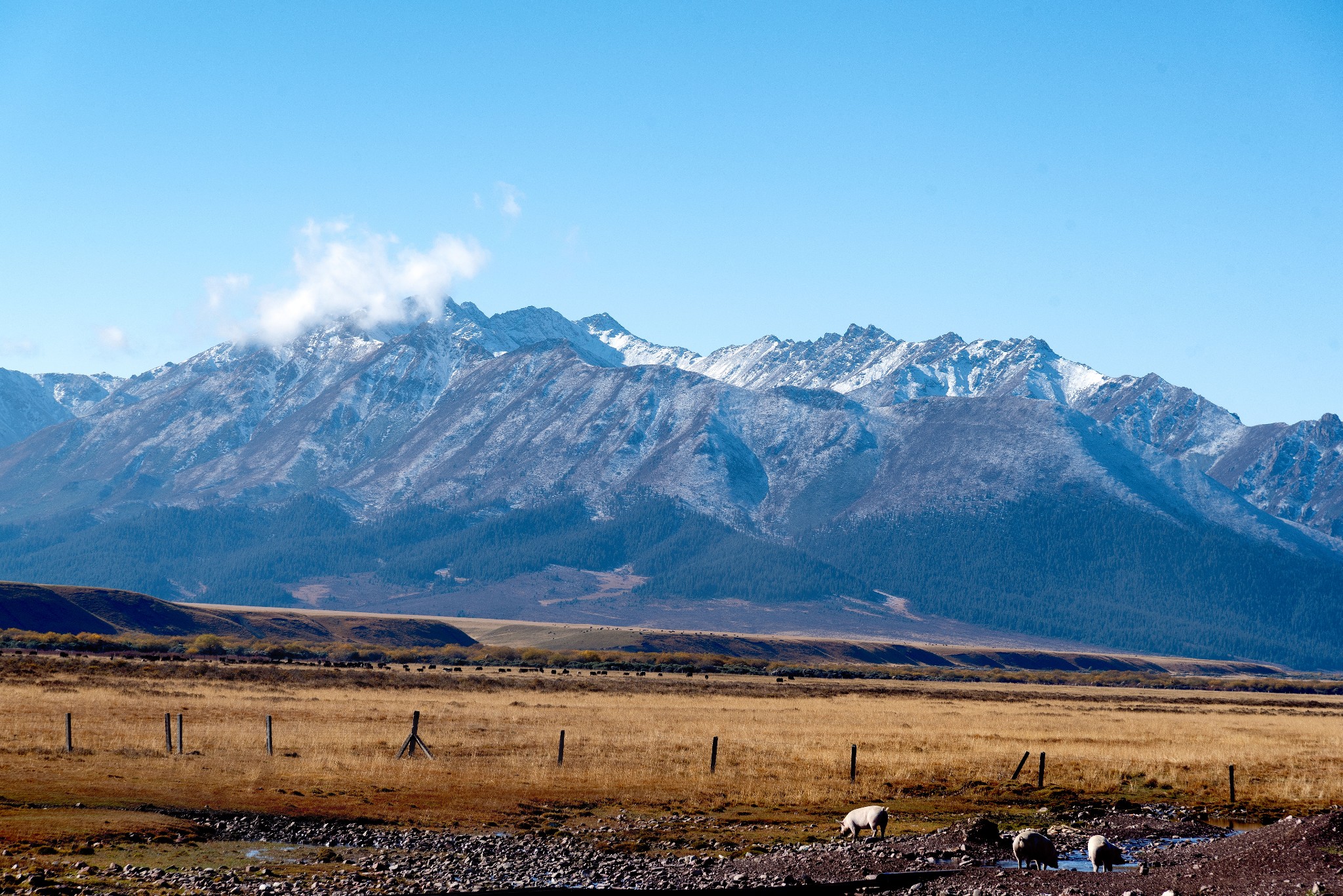 从那以后祁连山脚下的这片草原就成了天朝历代的皇家军马场,名叫山丹军马场。这是当今世界最大的军马场(曾经最大的在苏联,已经关闭了)。不过现在养军马的价值不大了,马场上目前主要是养牛和羊,只保留几百头军马用于留种和观赏之用。