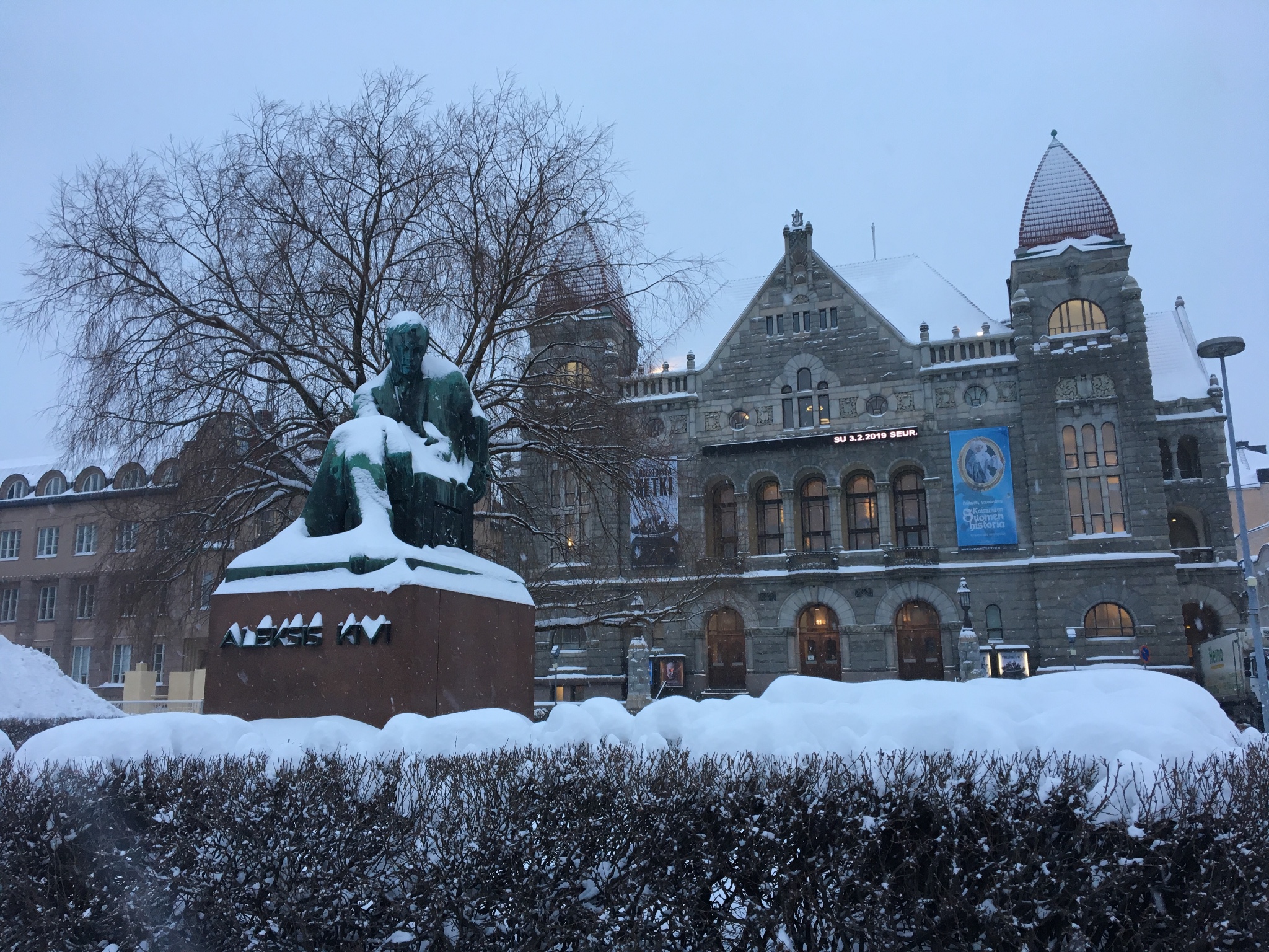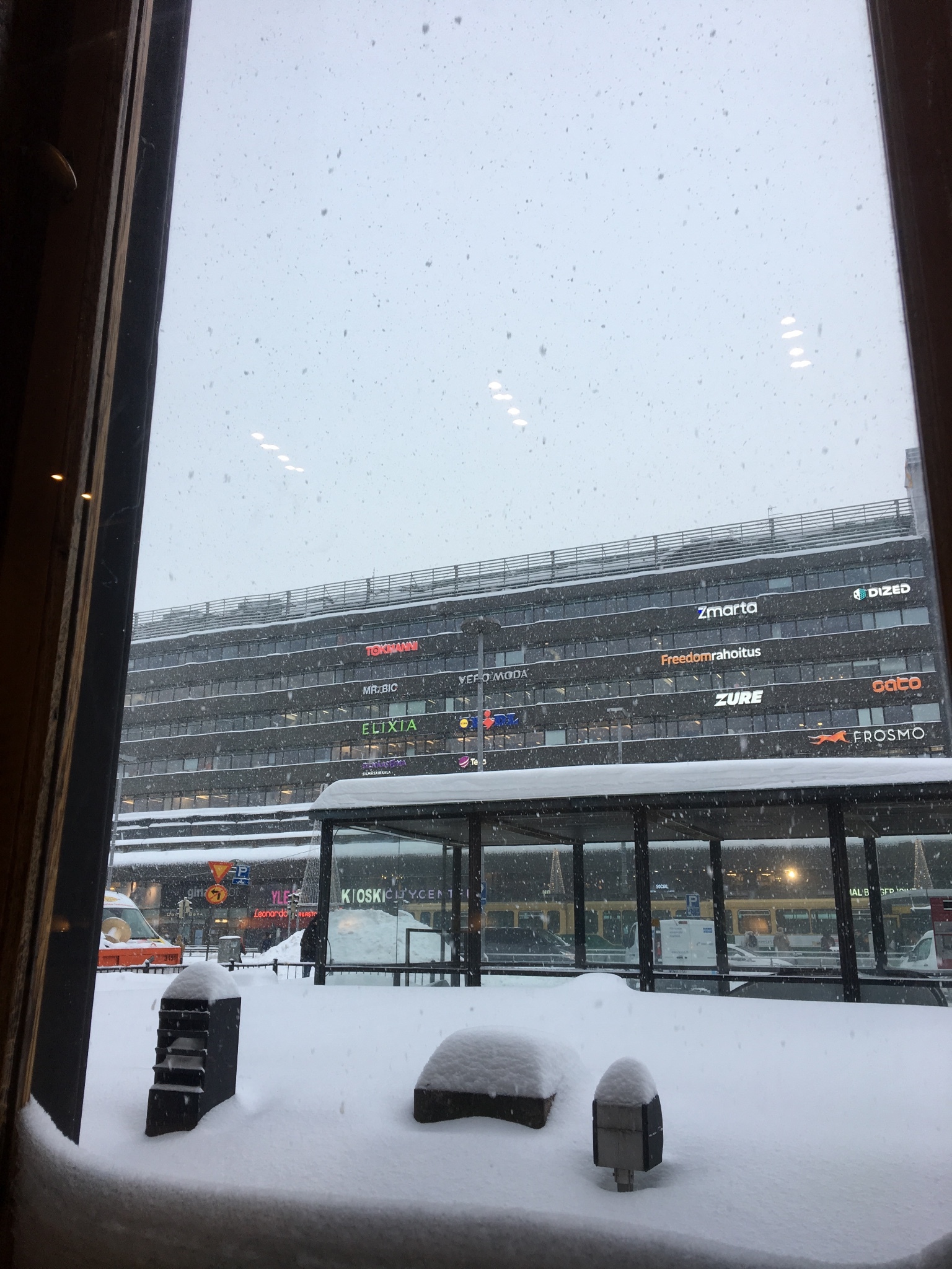 来到赫尔辛基市区天还没亮,但是意外的是已经有很多人在街上了,有些餐厅也开门了,当时7点不到,一直下着雪,南方孩子见到雪就是喜欢上去踩两脚。