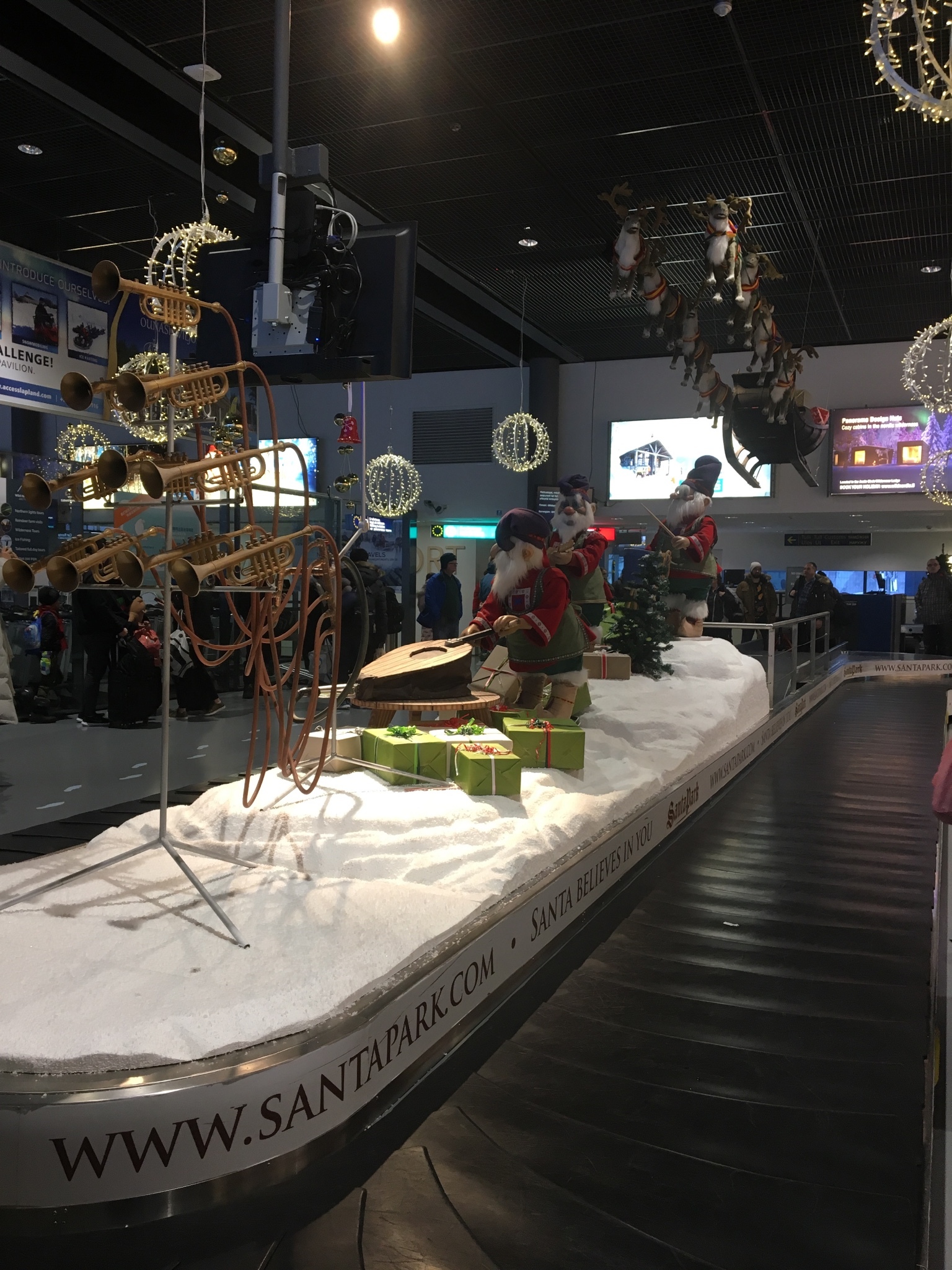 然后中午转机到了罗瓦涅米,圣诞老人的故乡。罗瓦涅米机场很小,行李转盘就已经很有圣诞的感觉了