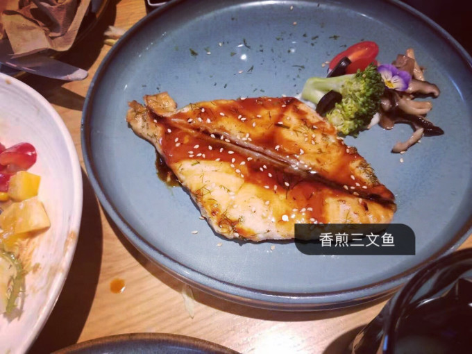 香煎三文鱼119元:火候正好,肉质鲜嫩,配上酱汁很棒。边边煎的鱼肉部分很酥脆。我喜欢稍肥腻的鱼皮部分。