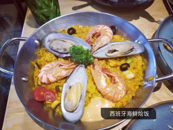 西班牙海鲜烩饭98元:颜色鲜亮,海鲜很新鲜,青口贝,大虾,墨鱼,米饭糯糯的。分量很足。