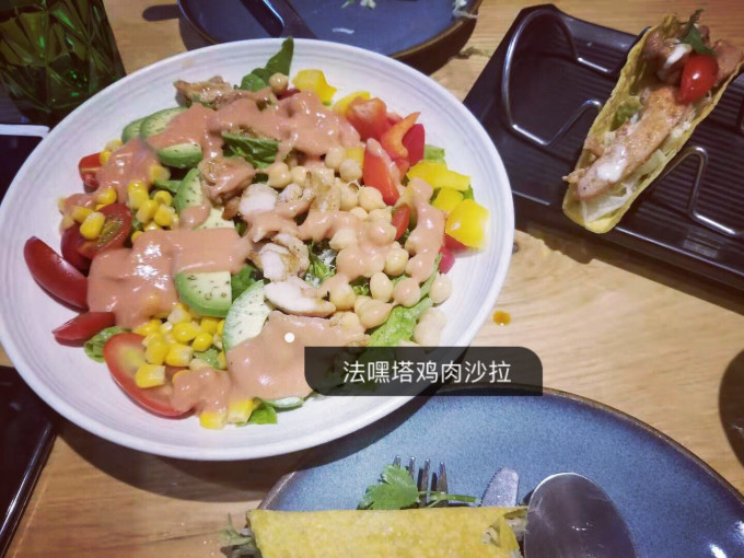 法嘿塔鸡肉沙拉42元:里面有鸡肉、牛油果、小番茄、彩椒粒、玉米粒、青豆和貌似鹰嘴豆的等等配上酱料。鸡肉很嫩不柴但牛油果熟过了。