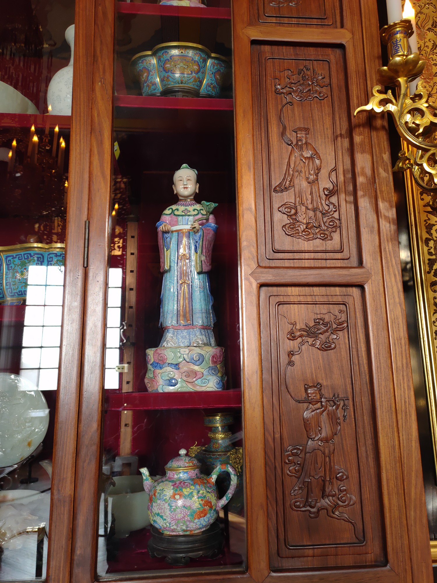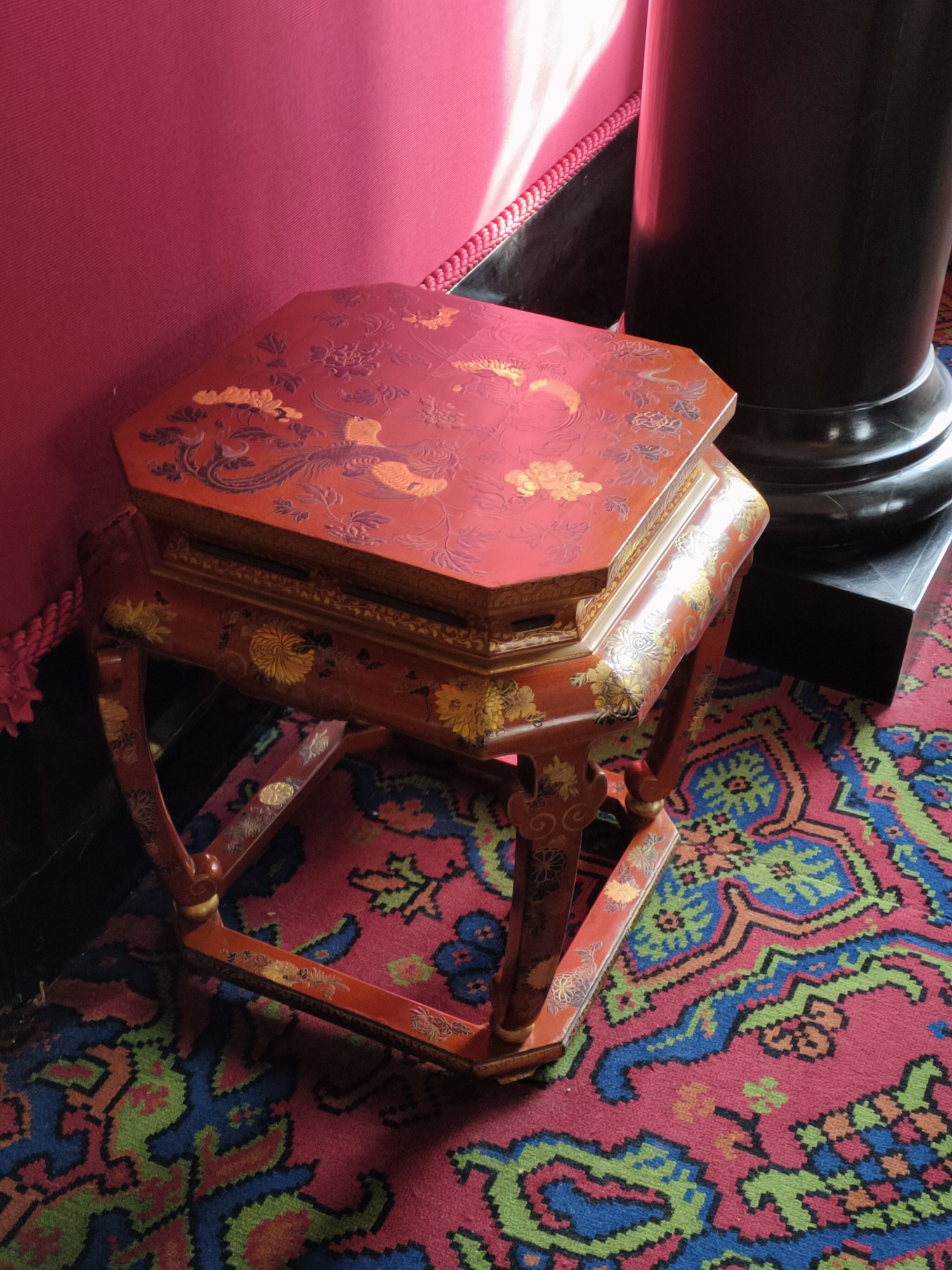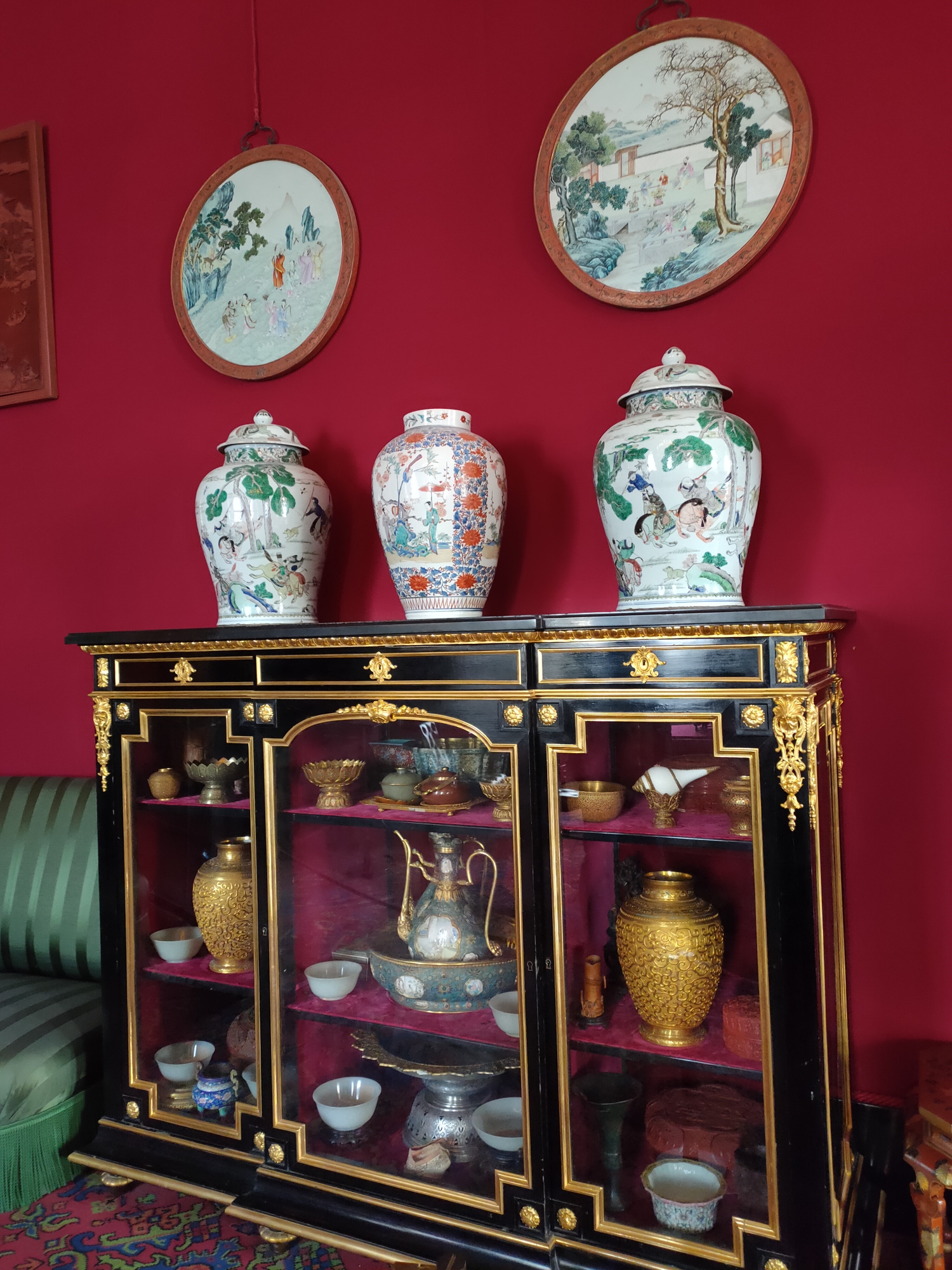 中国馆座落于欧也妮皇后沙龙,专门收藏皇后的远东藏品。这些文物中有些是英法联军在圆明园掳走的物品。万里之外与中国的瓷器、白玉、翡翠、水晶相遇,目不暇接。两盏宫灯人物花草栩栩如生,红木凳都是祝福图案,松鹤延年,龙凤呈祥。
