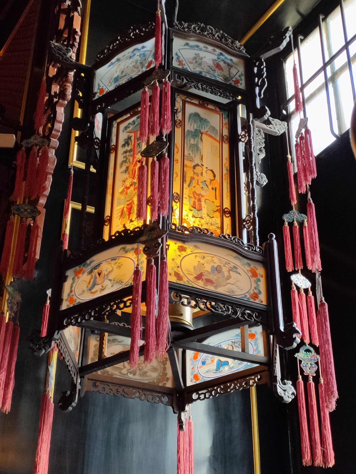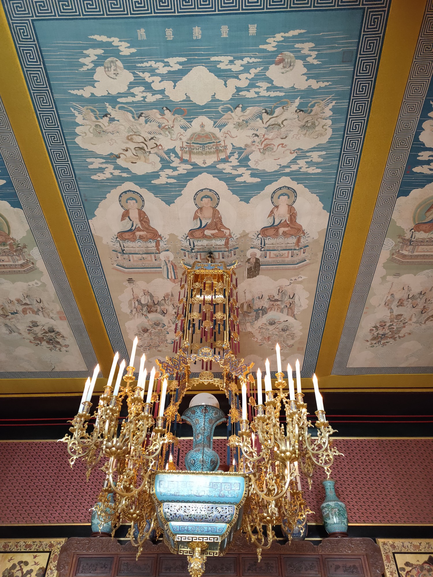 天花板上是三幅缂丝唐卡,乾隆年间的珍品。