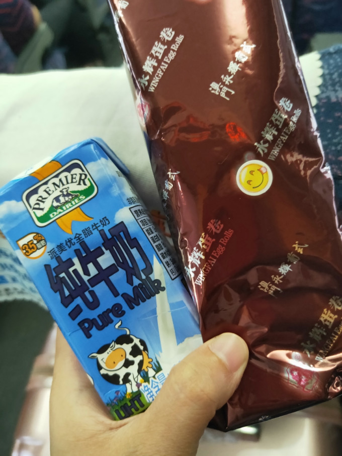 还好行李箱耐受,站得有点累就在行李箱上坐一坐,但是又想着行李箱也挺重的,要是坐坏了也不好啊,有7个多小时呢,最后直接席地而坐。了解到餐车只有吧台没有位置,觉得吃饭也不方便,还好出门前在家顺了蛋卷和牛奶。