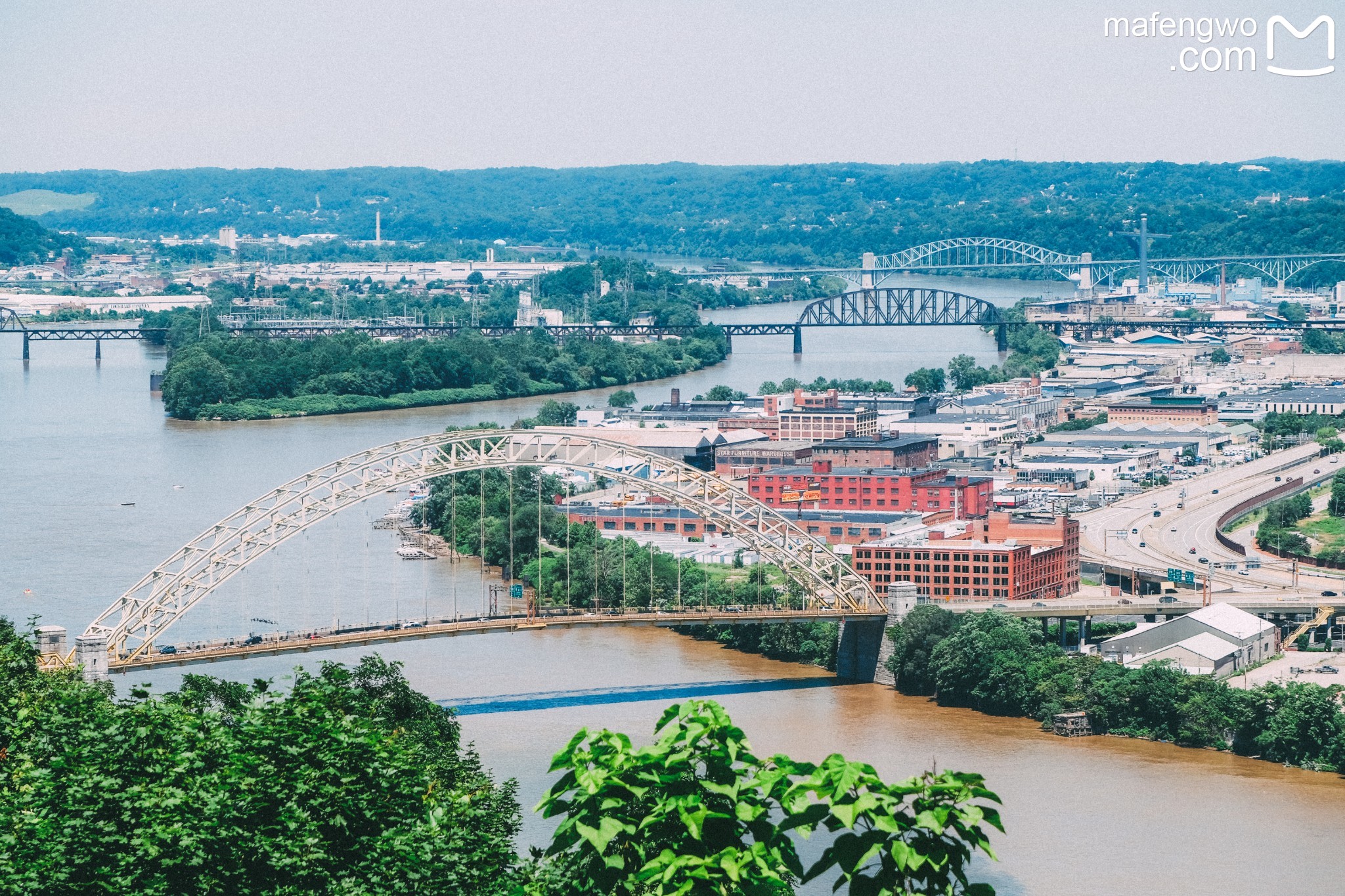 匹兹堡被河流分成许多块,有着依山旁水的清秀,靠着牢固的钢铁大桥把不同的地段连接起来。所以,到山上看桥成为到这里游览的一景。一架百年历史的路轨配上老式车厢,虽然两条铁轨上各自只有一辆车厢,但是看到40多度的倾斜角的轨道,只靠电动机拖动钢缆就把车厢从水边拖到山上,也为工程的安全捏一把汗。