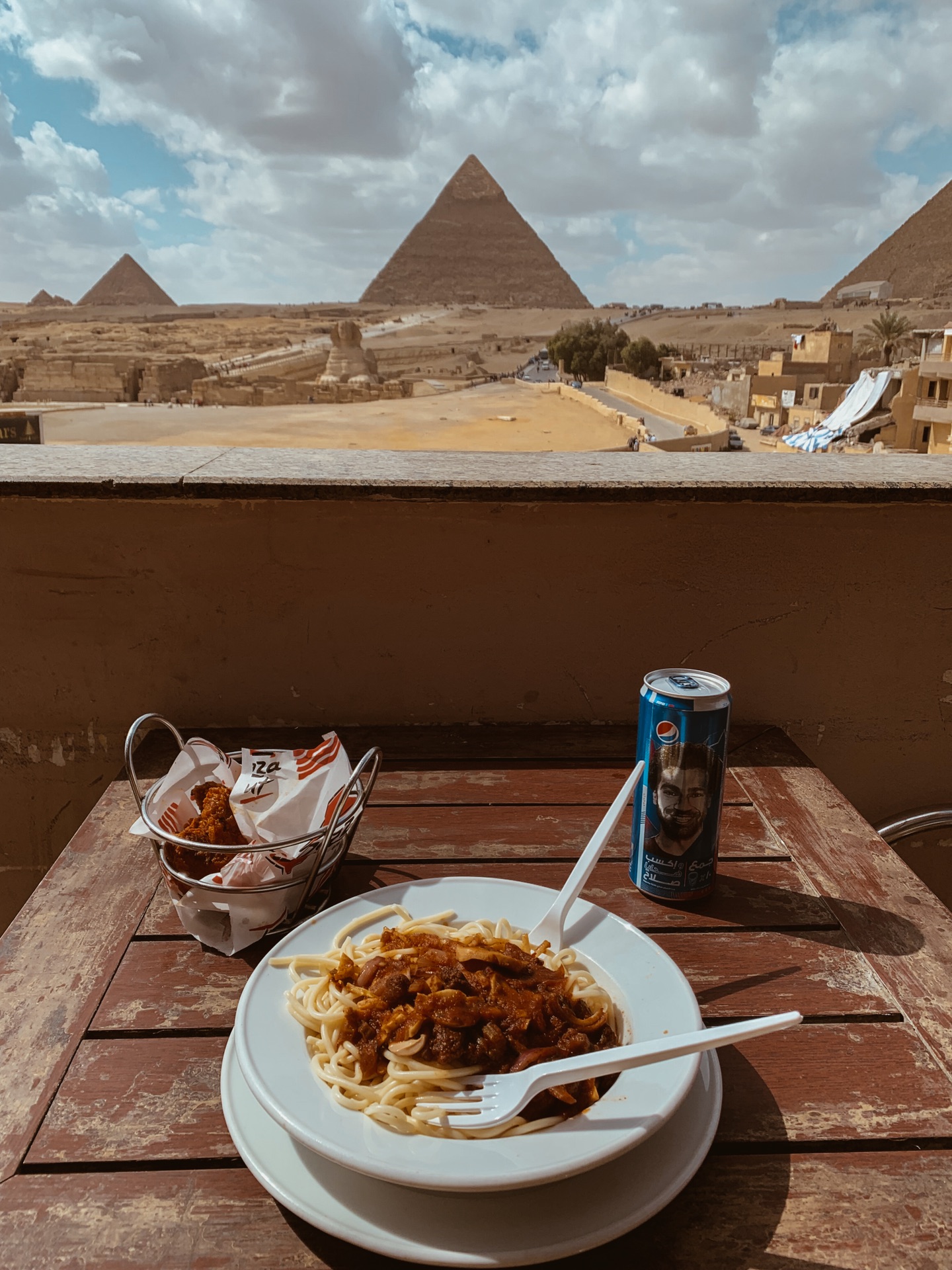 在楼顶可以面对着金字塔和狮身人面像,吹着带沙土的微风,吃意面