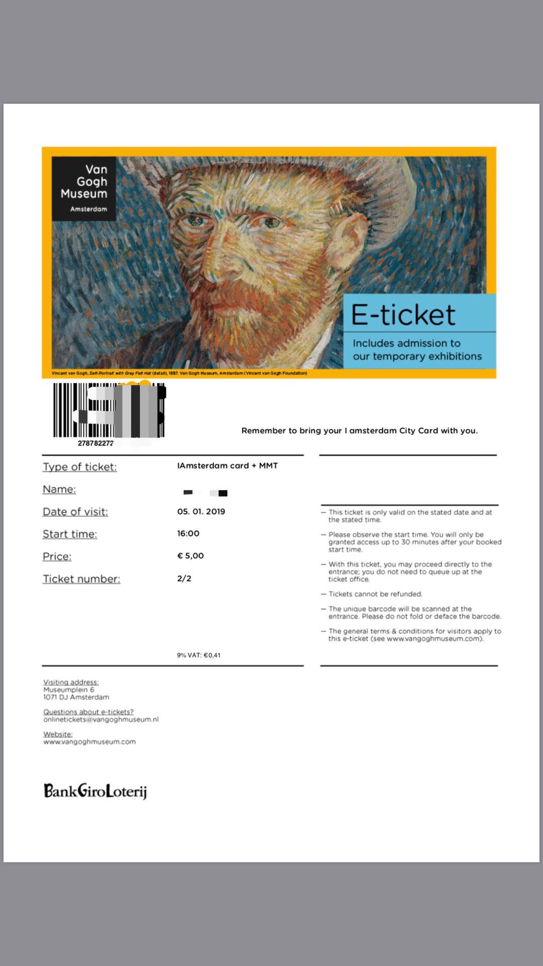 和迈雅先生一月初去荷兰渡了个长周末,一落地荷兰就买了72小时的通卡(市内交通+博物馆可通用),并在网上预定了第三天的梵高博物馆的票以及Audio。去梵高博物馆的人真多,*所以一定要网上预约入场时间*而不用排长龙队等候。因为有了通卡,入场是免费的,只是租讲解器时在网上支付了每个5欧元的价格。