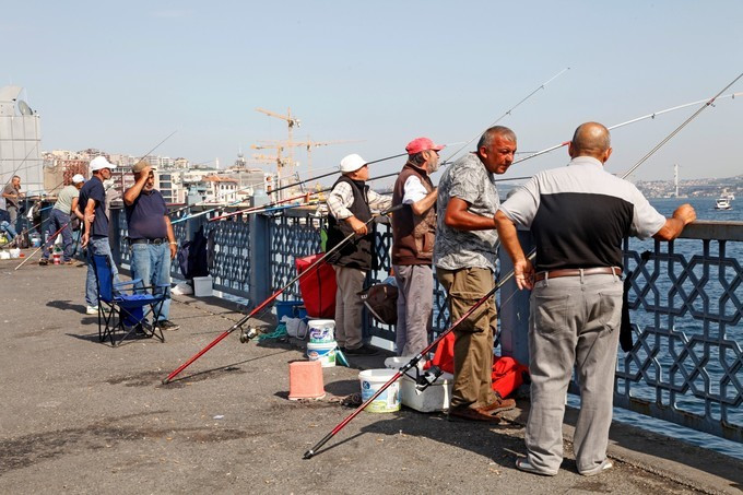 加拉达大桥 Galata Köprüsü,连接蓝色清真寺区和塔克西姆区的跨海峡桥,新清真寺对面,有T1轻轨通过。每天桥上很多钓鱼的人。