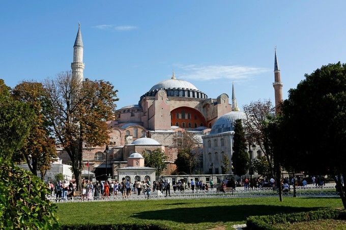 圣索菲亚教堂 Ayasofya Müzesi,东正教和伊斯兰教的建筑结合体,东罗马拜占庭时期产物。伊斯坦布尔最著名的古迹,就在蓝色清真寺北对面。售票点在进口大门右侧的小亭子里。