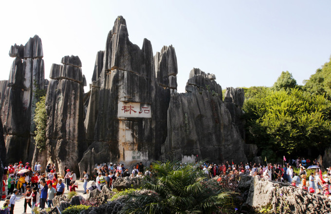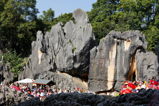 步入大石林,首先引入眼帘的是所有宣传石林都会拍的“石林”二字的题字,大字是由云南省国民政府龙云题的。