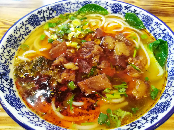 休息了一会儿,决定找吃的去。酒店后身和侧面也有很多吃的,我们转了一大圈,发现这里的吃食以烤串为主,挑来挑去,进了一家面食店,里面有拉面、米线、饼子夹肉多种小吃。同行的伙伴大多点了拉面。来云南了,干嘛还吃家乡的拉面?雪柔自己点了牛肉米线,是雪柔喜欢的味道。